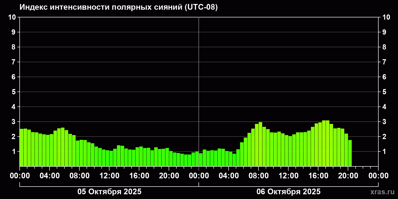Изменения индекса интенсивности полярных сияний с 2025-10-05 по 2025-10-06 по местному времени
