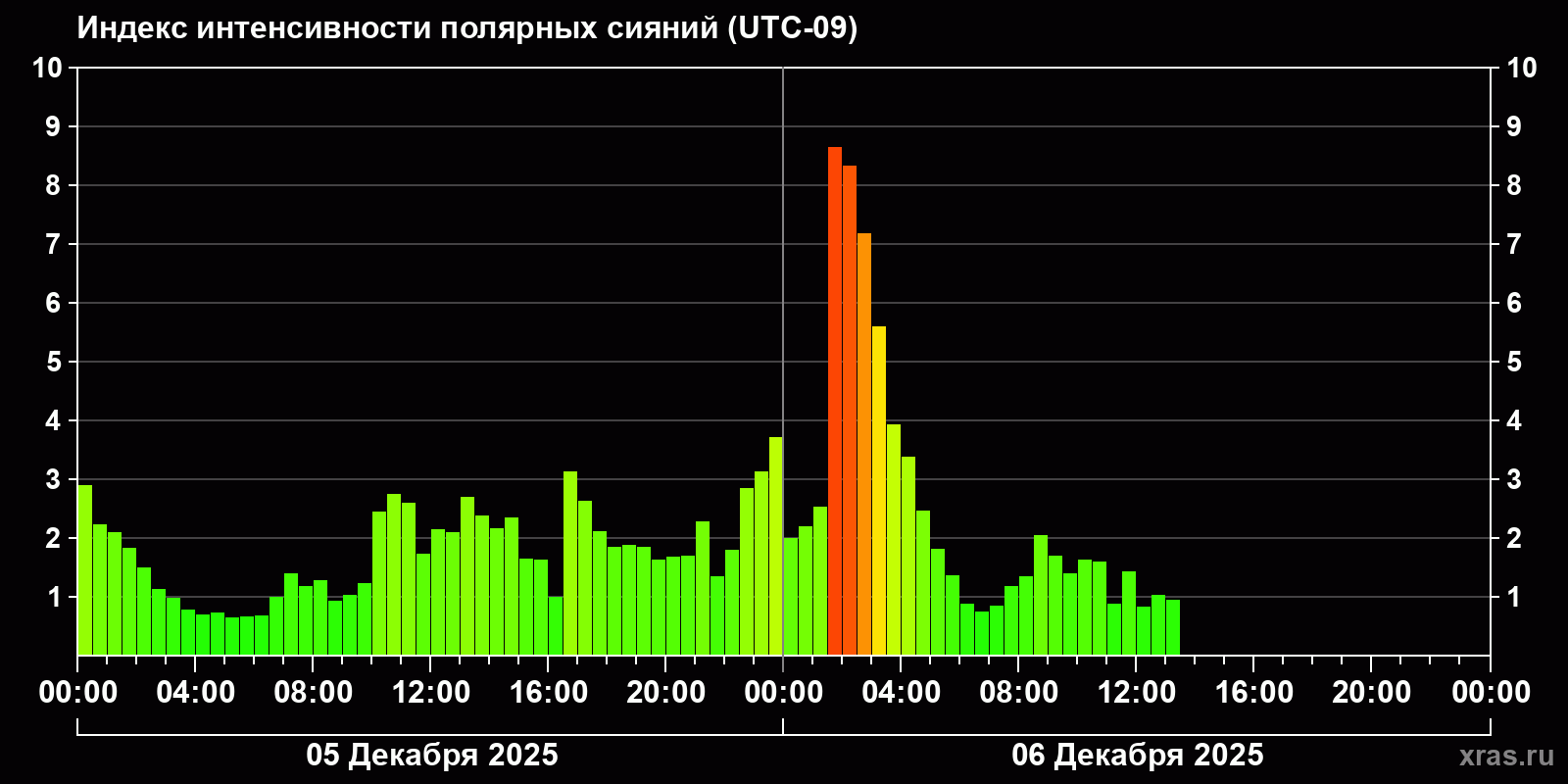 Изменения индекса интенсивности полярных сияний с 2025-12-05 по 2025-12-06 по местному времени
