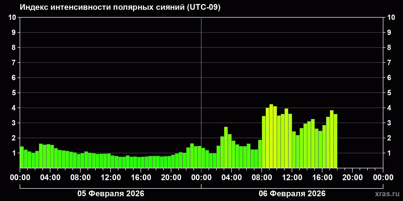 Изменения индекса интенсивности полярных сияний с 2026-02-05 по 2026-02-06 по местному времени