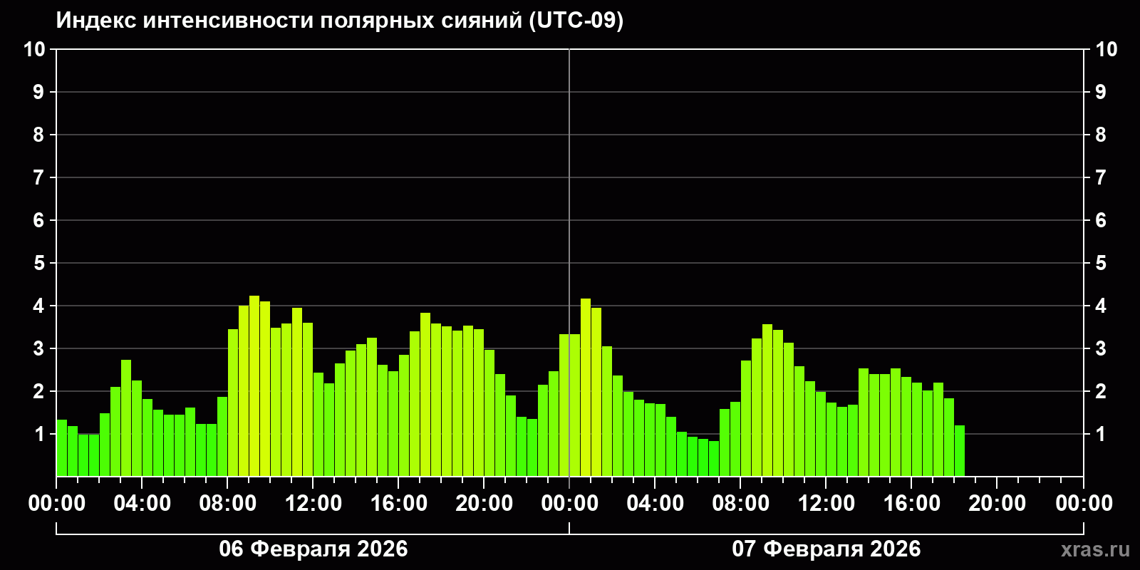 Изменения индекса интенсивности полярных сияний с 2026-02-06 по 2026-02-07 по местному времени