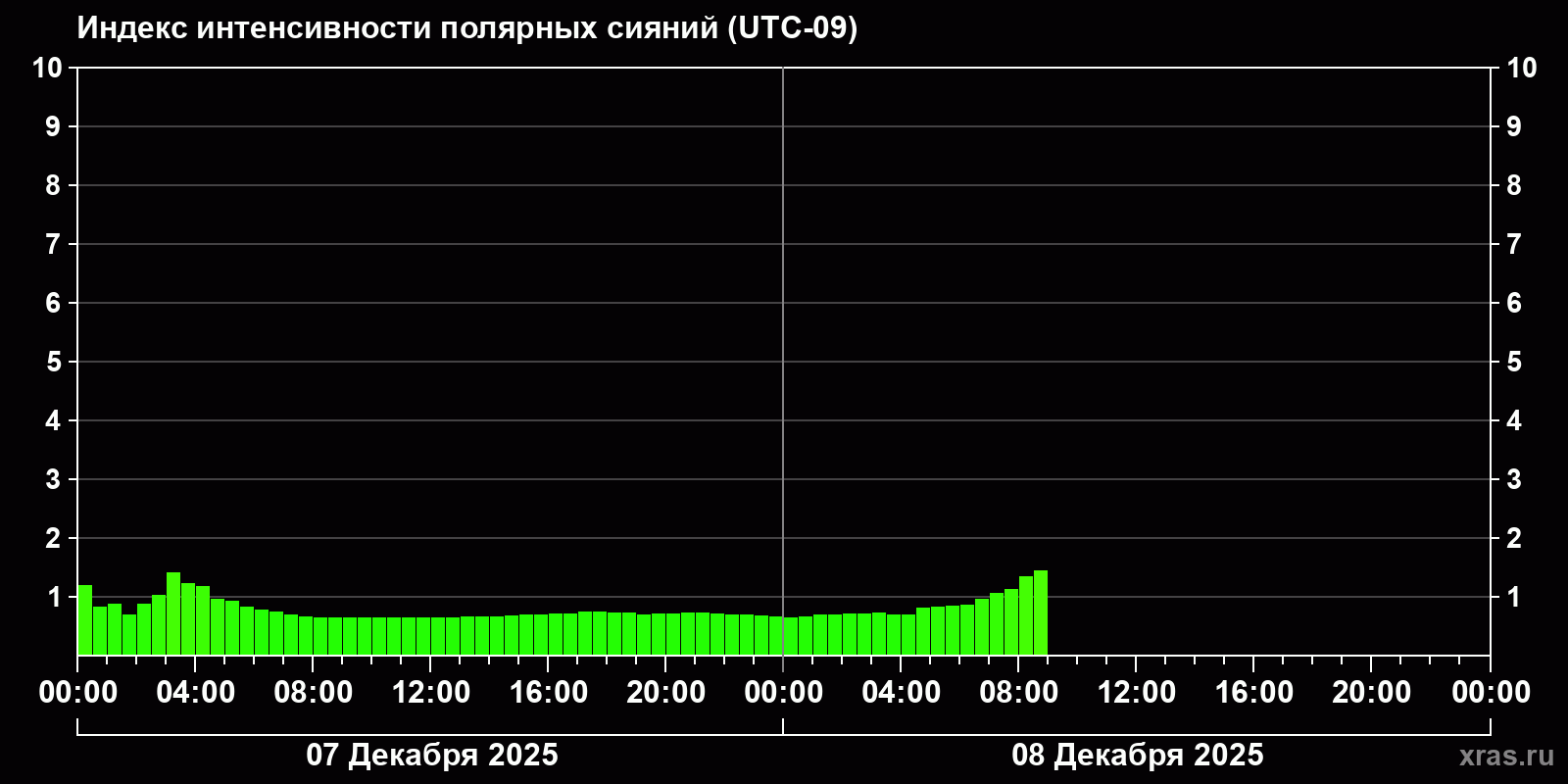 Изменения индекса интенсивности полярных сияний с 2025-12-07 по 2025-12-08 по местному времени