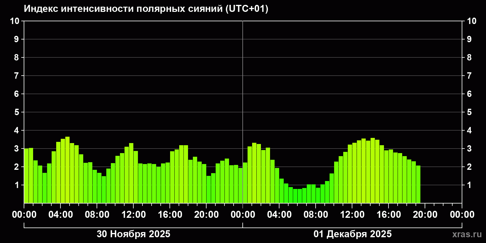 Изменения индекса интенсивности полярных сияний с 2025-11-30 по 2025-12-01 по местному времени