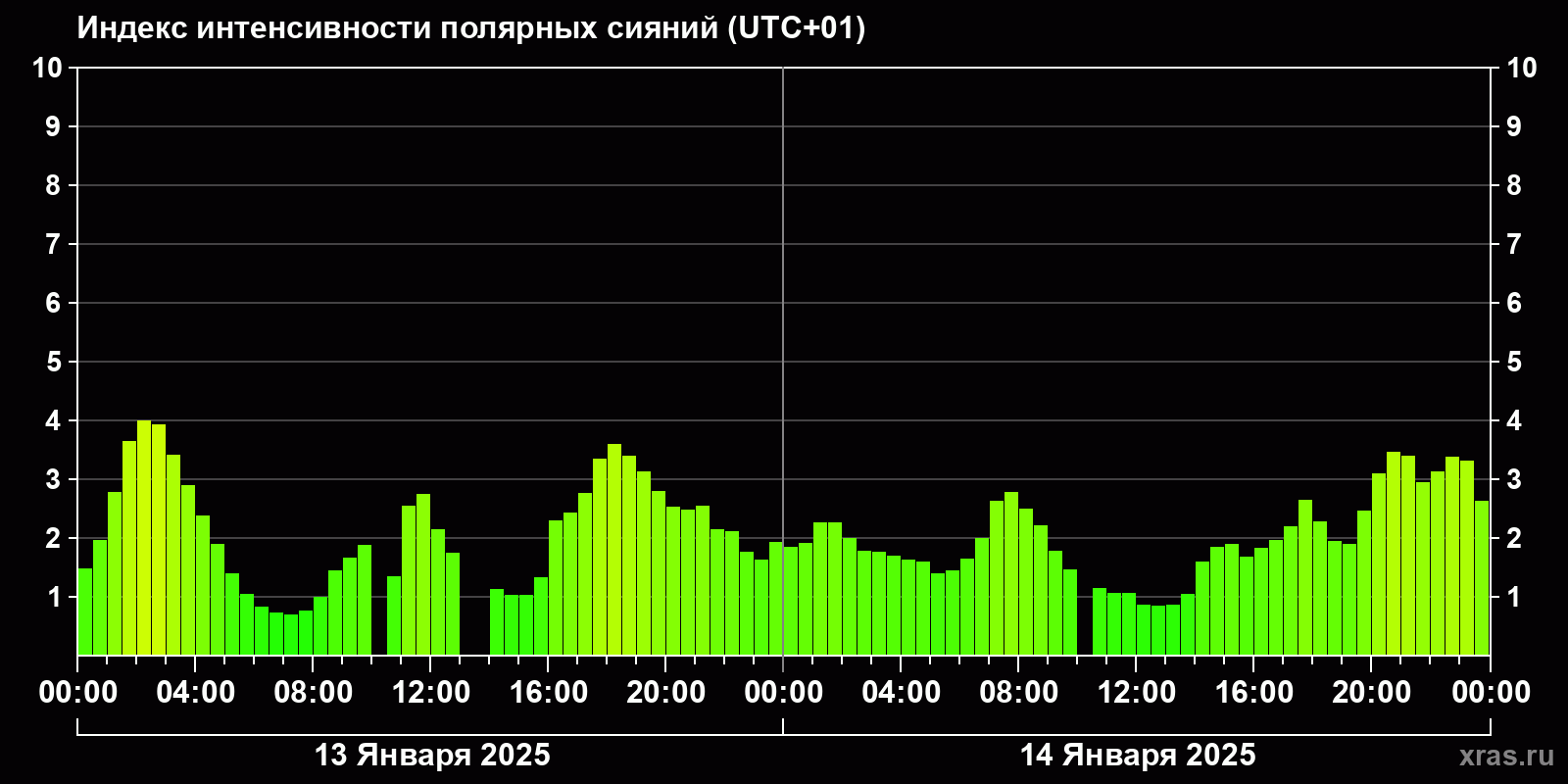 Изменения индекса интенсивности полярных сияний с 2025-01-13 по 2025-01-14 по местному времени