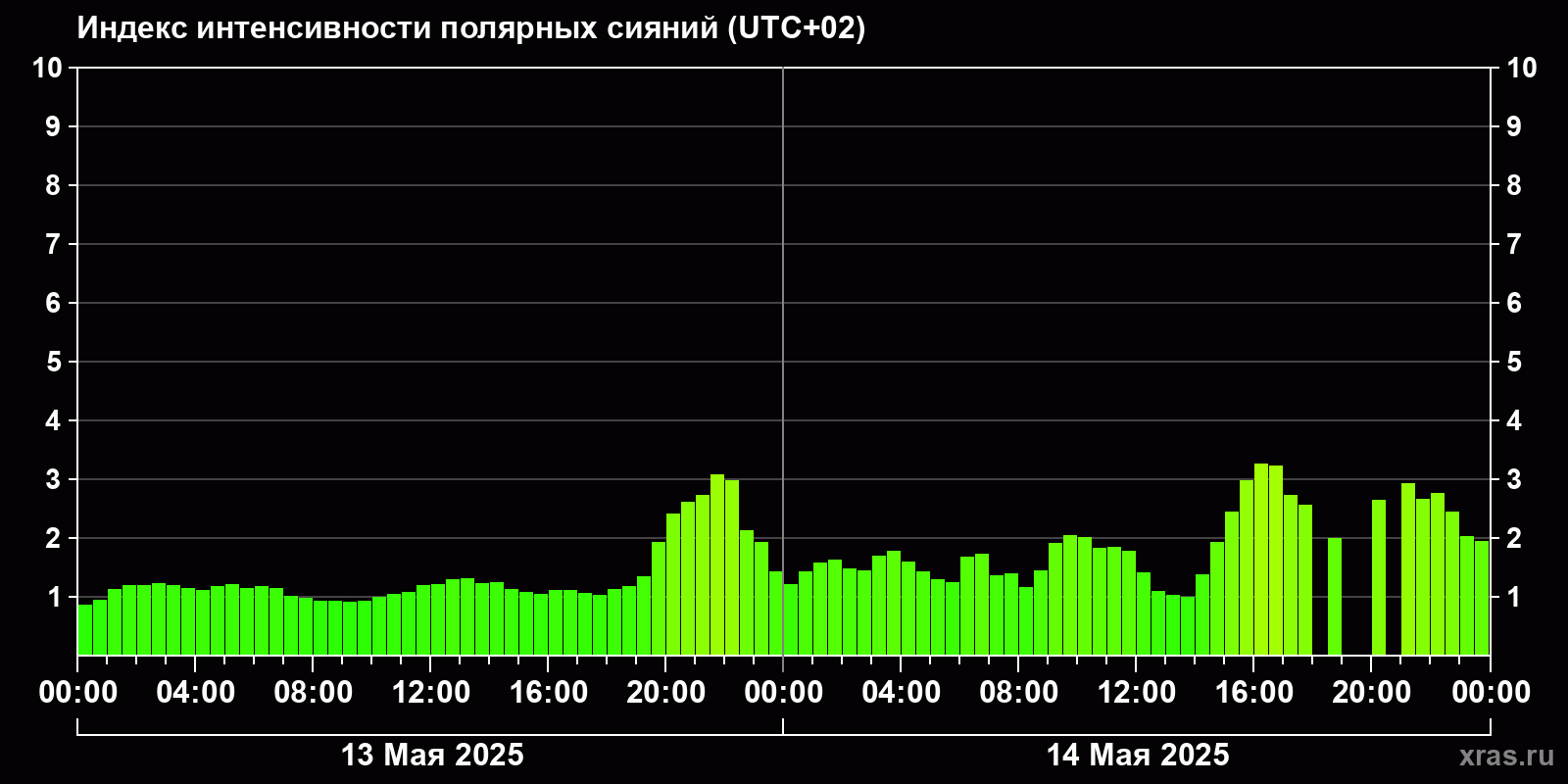 Изменения индекса интенсивности полярных сияний с 2025-05-13 по 2025-05-14 по местному времени