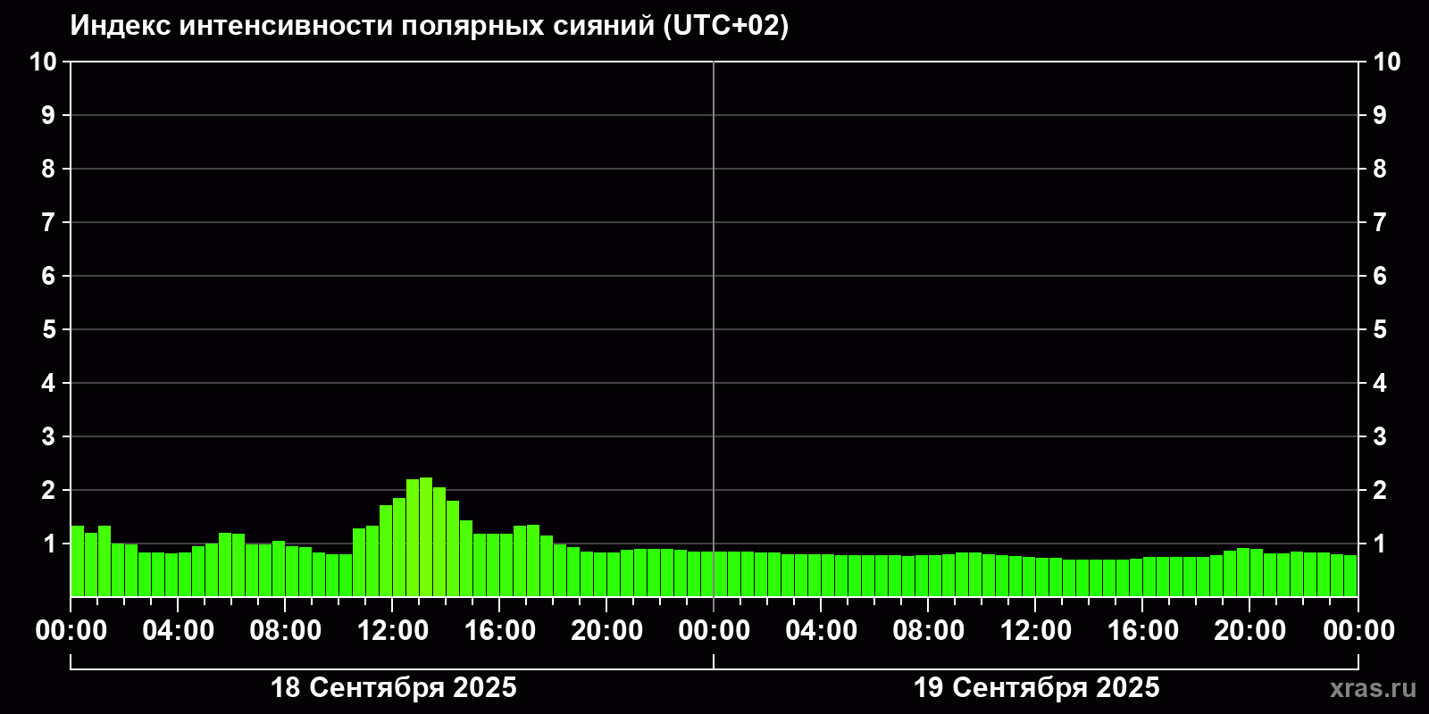 Изменения индекса интенсивности полярных сияний с 2025-09-18 по 2025-09-19 по местному времени