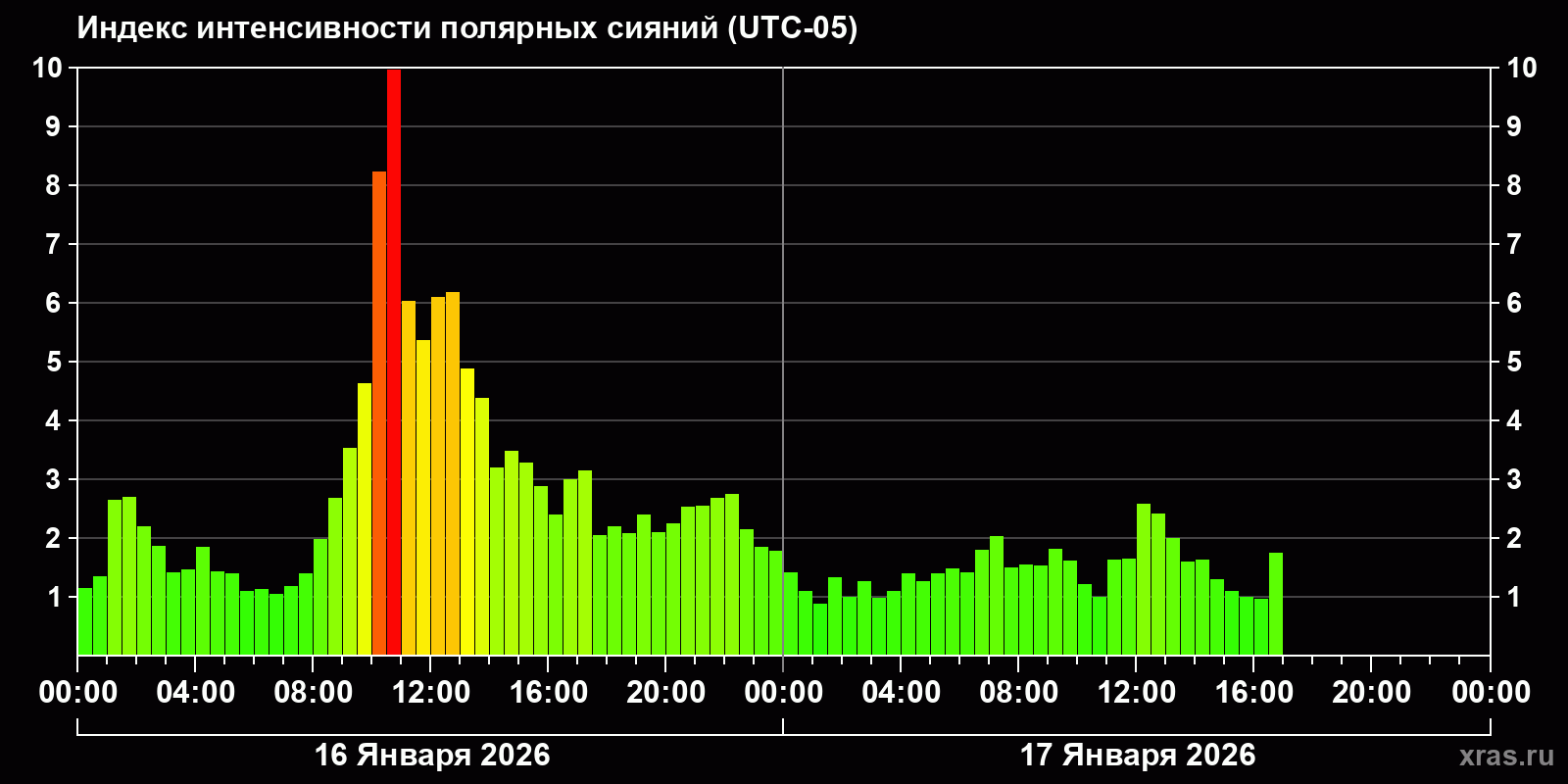 Изменения индекса интенсивности полярных сияний с 2026-01-16 по 2026-01-17 по местному времени
