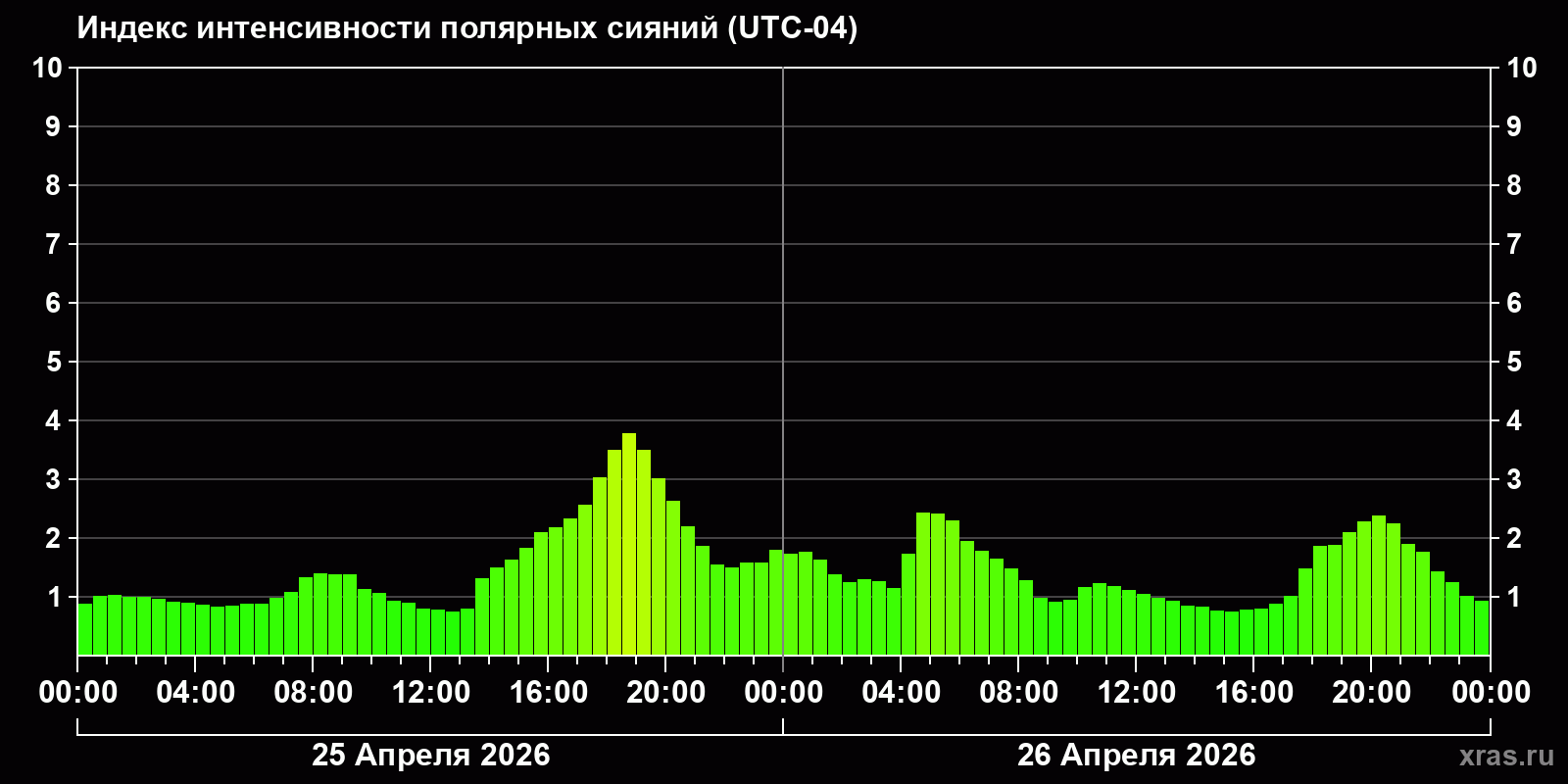Изменения индекса интенсивности полярных сияний с 2026-04-25 по 2026-04-26 по местному времени