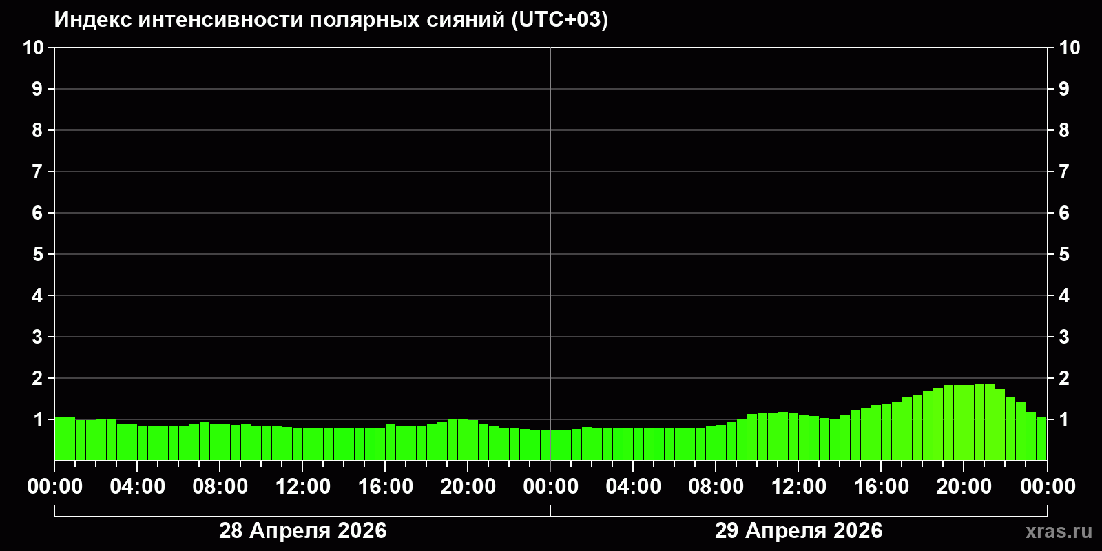Изменения индекса интенсивности полярных сияний с 2026-04-28 по 2026-04-29 по местному времени