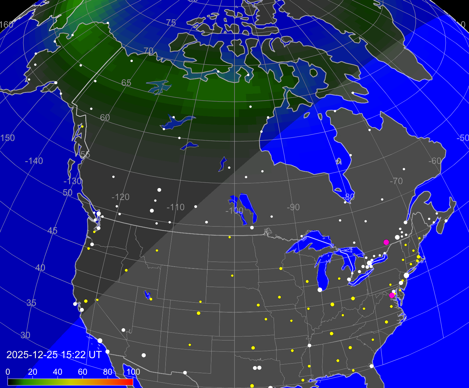 Изменения и часовой прогноз индекса интенсивности полярных сияний с 2025-12-23 по 2025-12-24