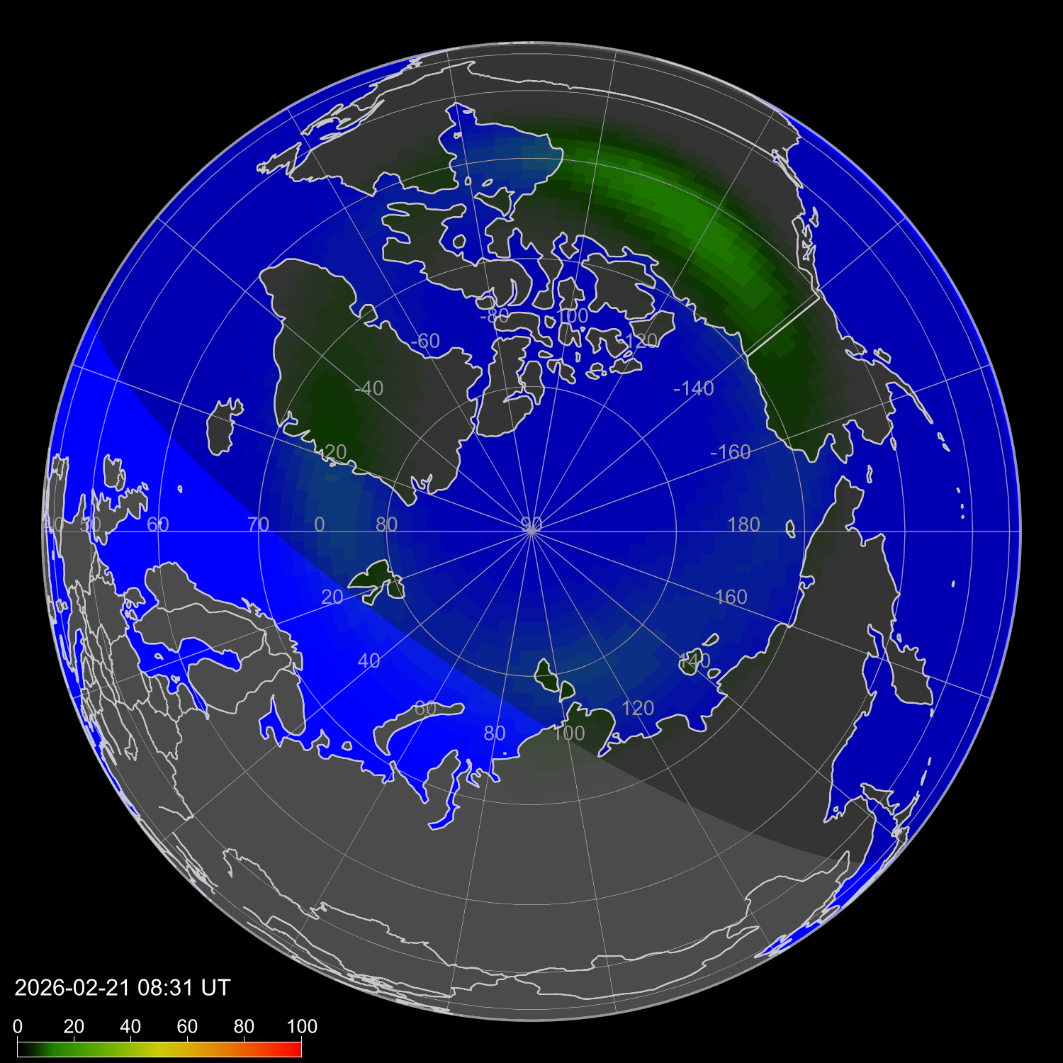 Индекс интенсивности полярных сияний и теоретически возможная широта наблюдений для ночного времени в западном полушарии
