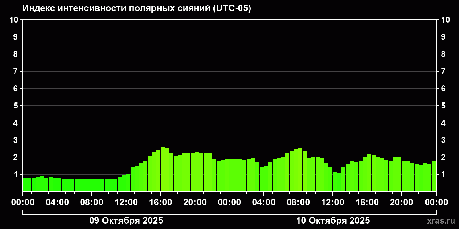 Изменения индекса интенсивности полярных сияний с 2025-10-09 по 2025-10-10 по местному времени