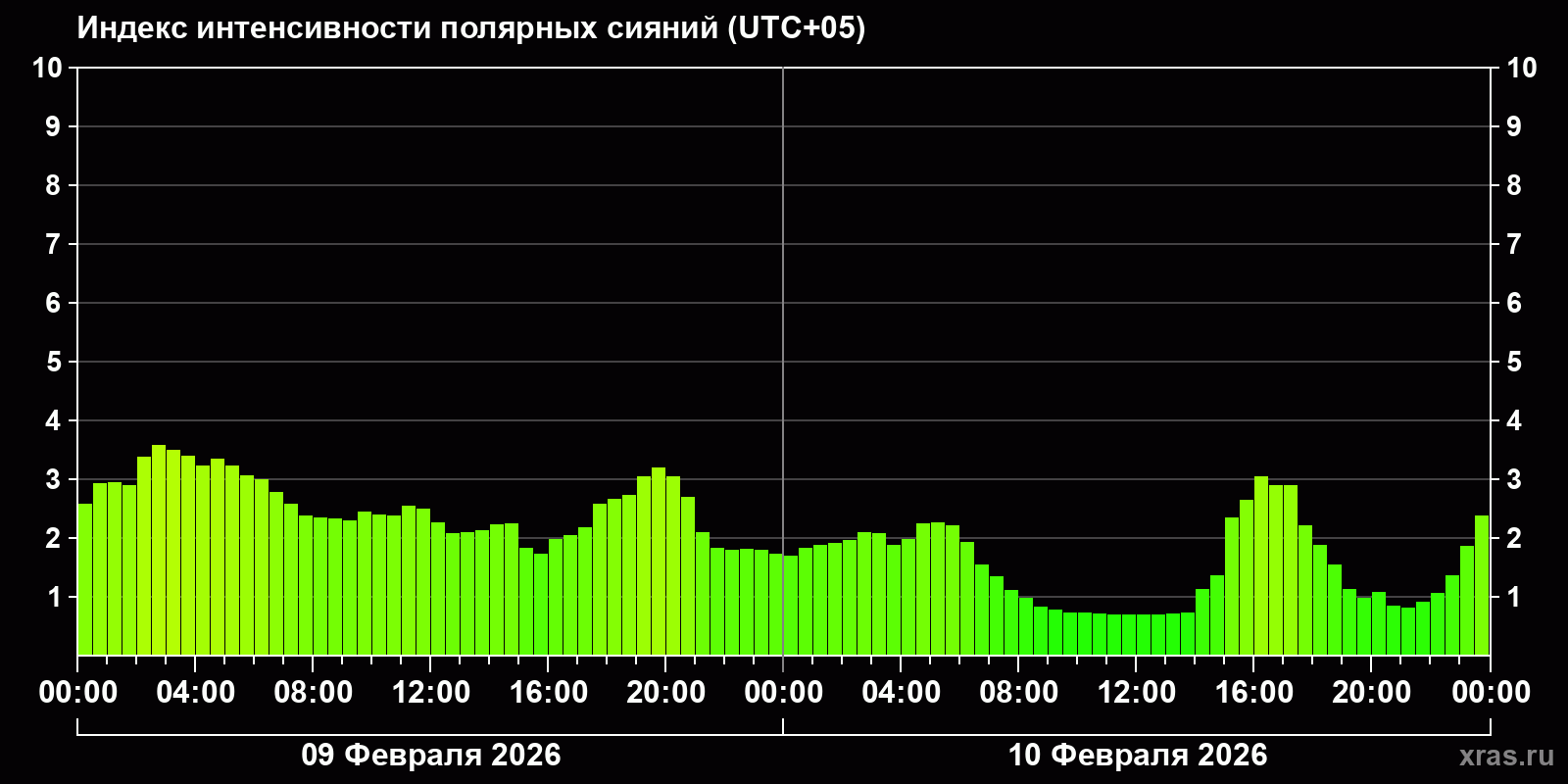 Изменения индекса интенсивности полярных сияний с 2026-02-09 по 2026-02-10 по местному времени