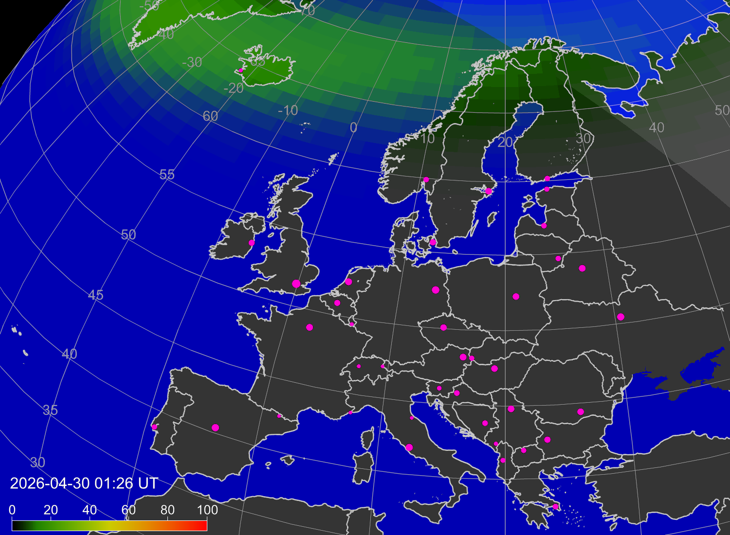 Вероятность полярных сияний в городах Европы