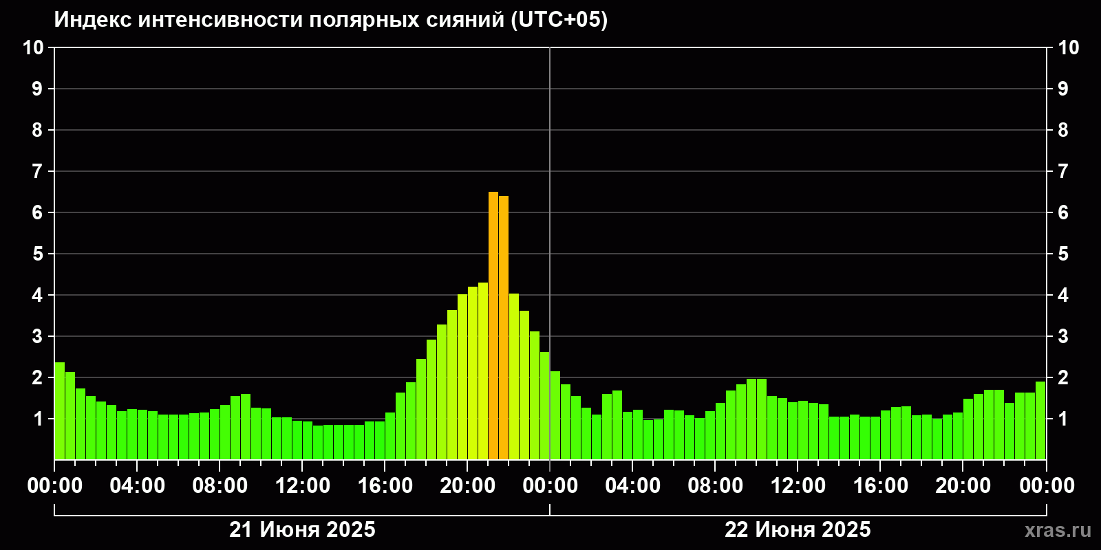 Изменения индекса интенсивности полярных сияний с 2025-06-21 по 2025-06-22 по местному времени