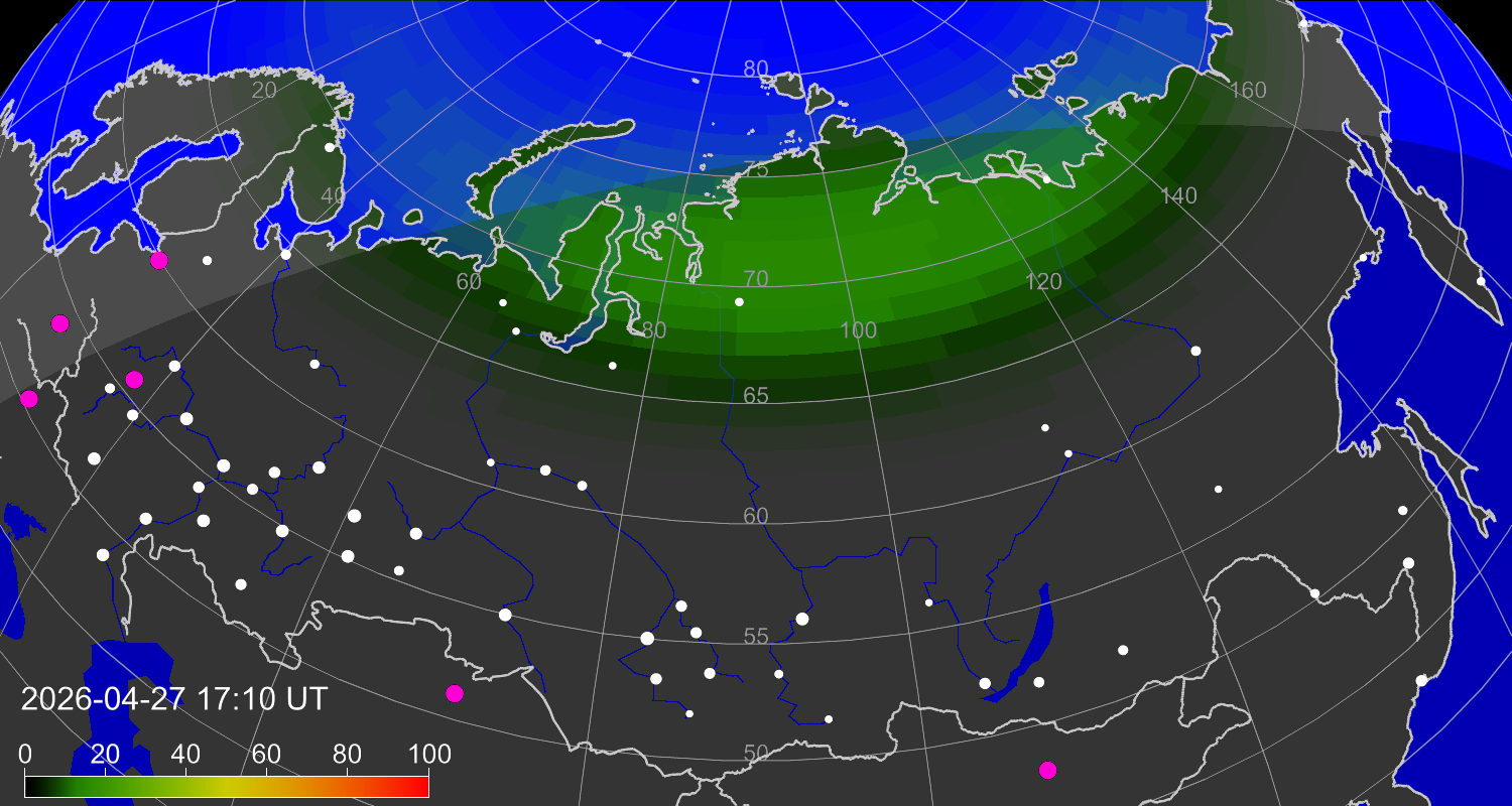 Вероятность полярных сияний в городах Российской Федерации