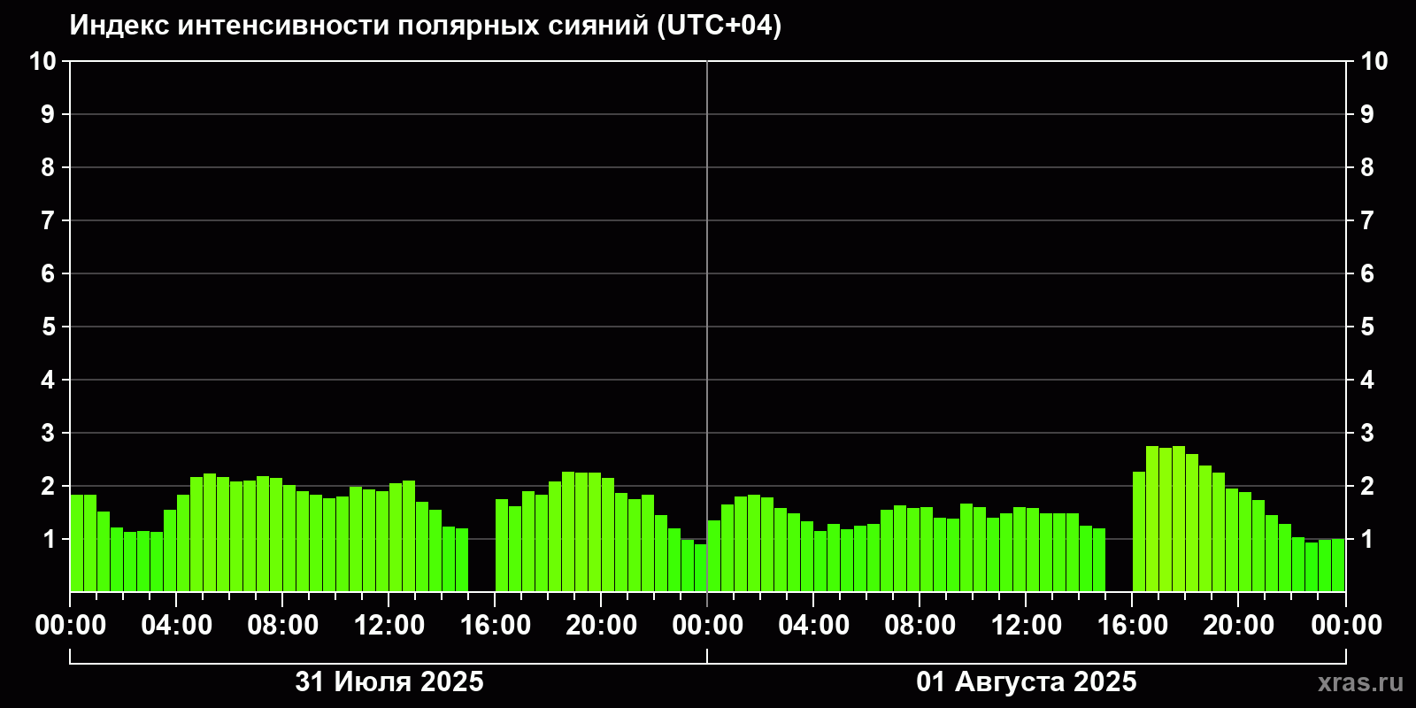 Изменения индекса интенсивности полярных сияний с 2025-07-31 по 2025-08-01 по местному времени