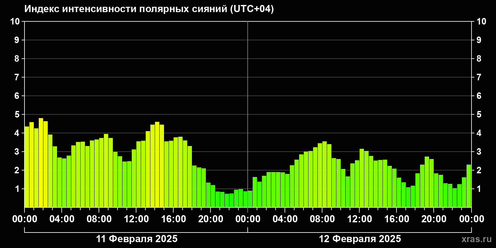 Изменения индекса интенсивности полярных сияний с 2025-02-11 по 2025-02-12 по местному времени