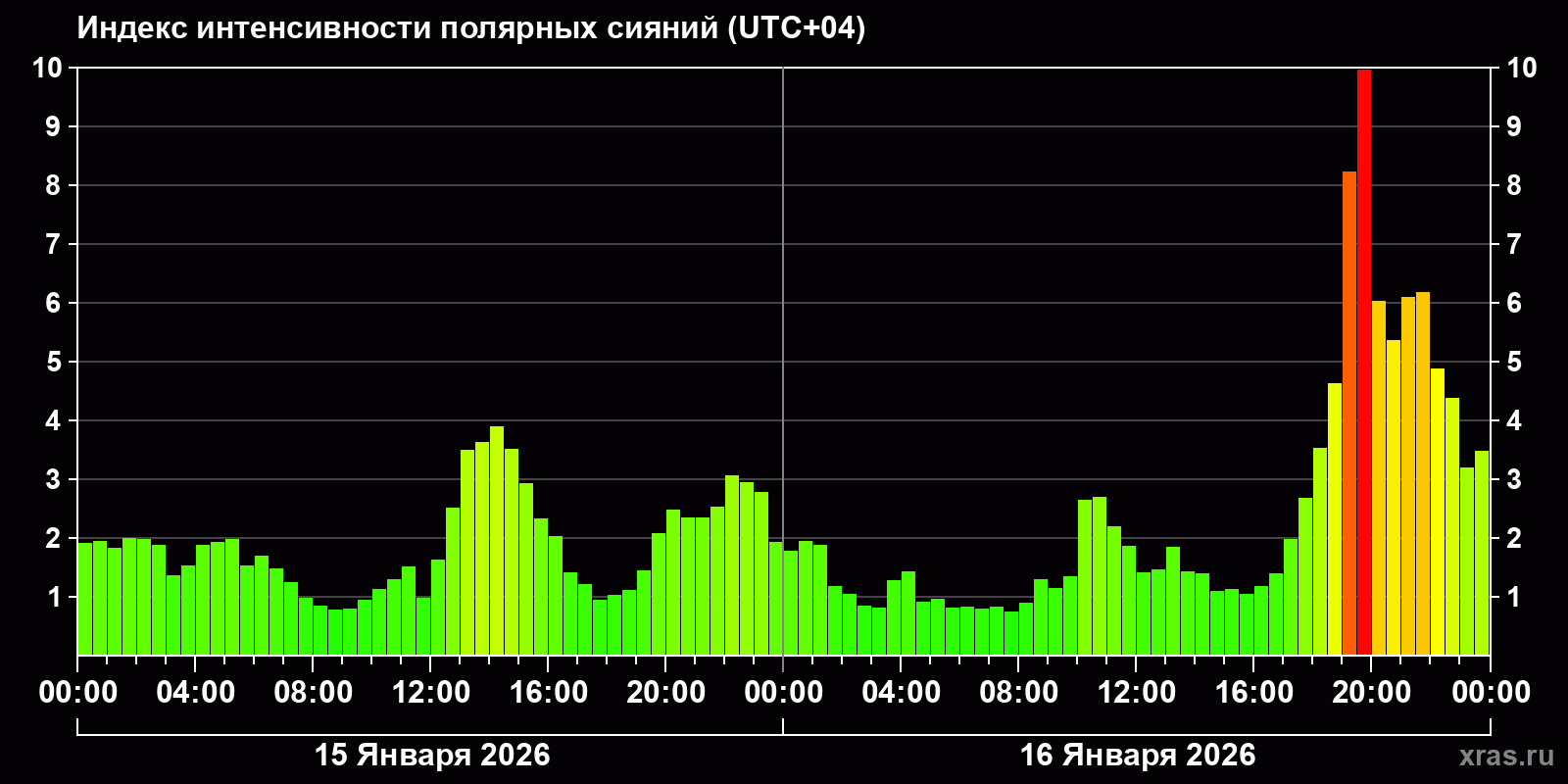 Изменения индекса интенсивности полярных сияний с 2026-01-15 по 2026-01-16 по местному времени