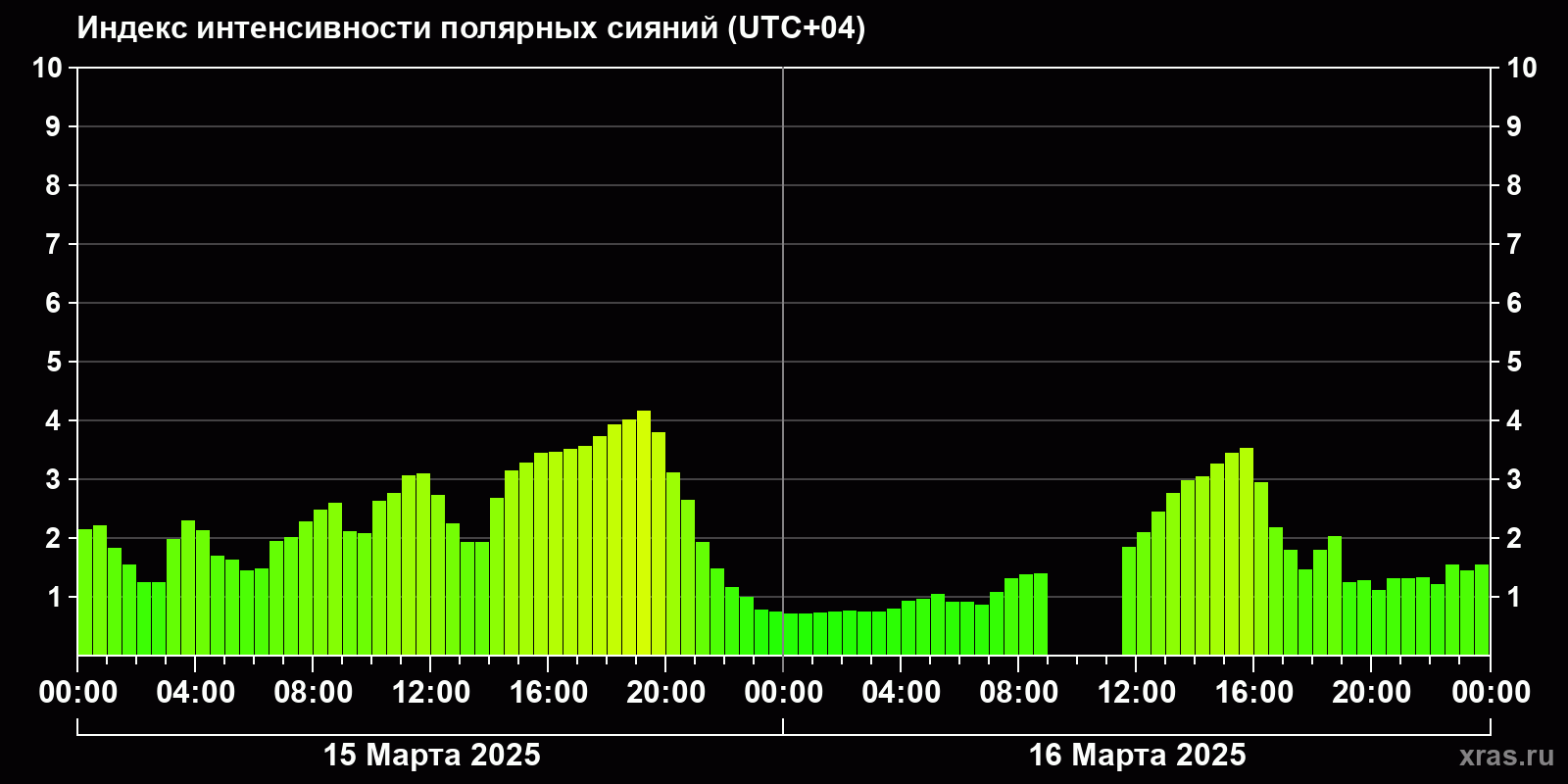 Изменения индекса интенсивности полярных сияний с 2025-03-15 по 2025-03-16 по местному времени
