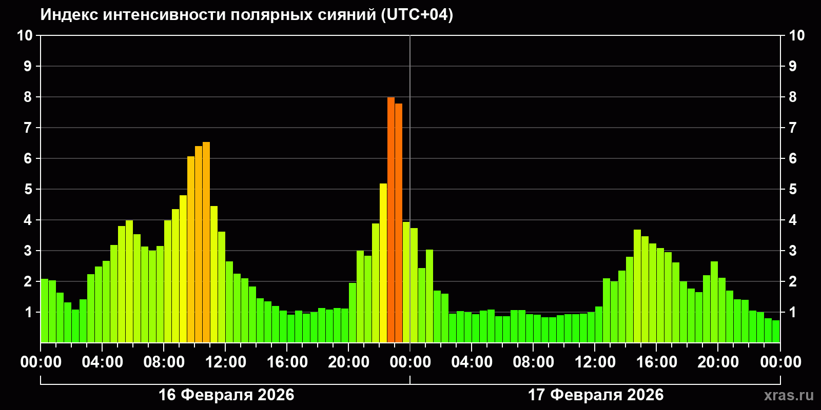Изменения индекса интенсивности полярных сияний с 2026-02-16 по 2026-02-17 по местному времени