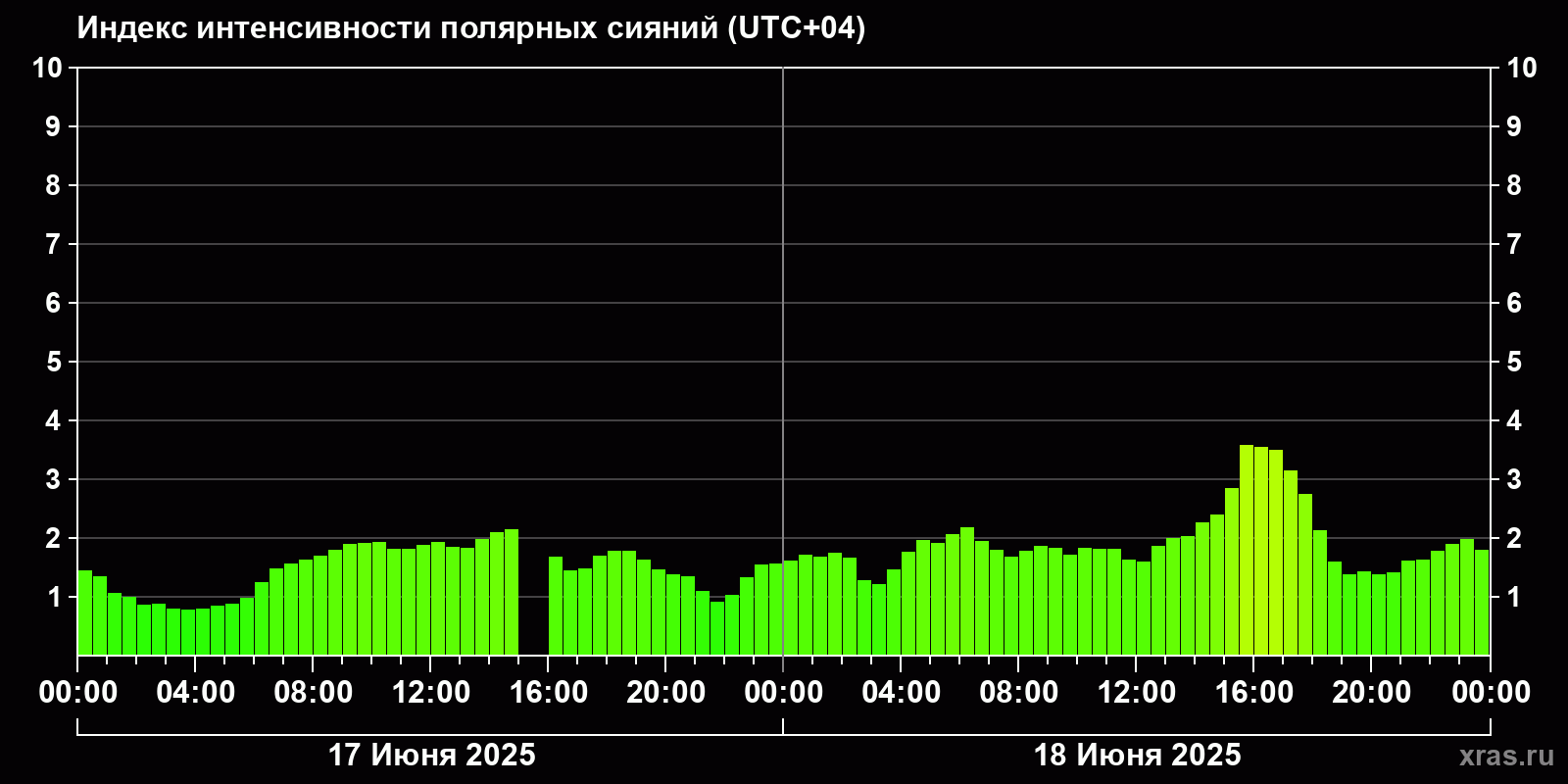 Изменения индекса интенсивности полярных сияний с 2025-06-17 по 2025-06-18 по местному времени