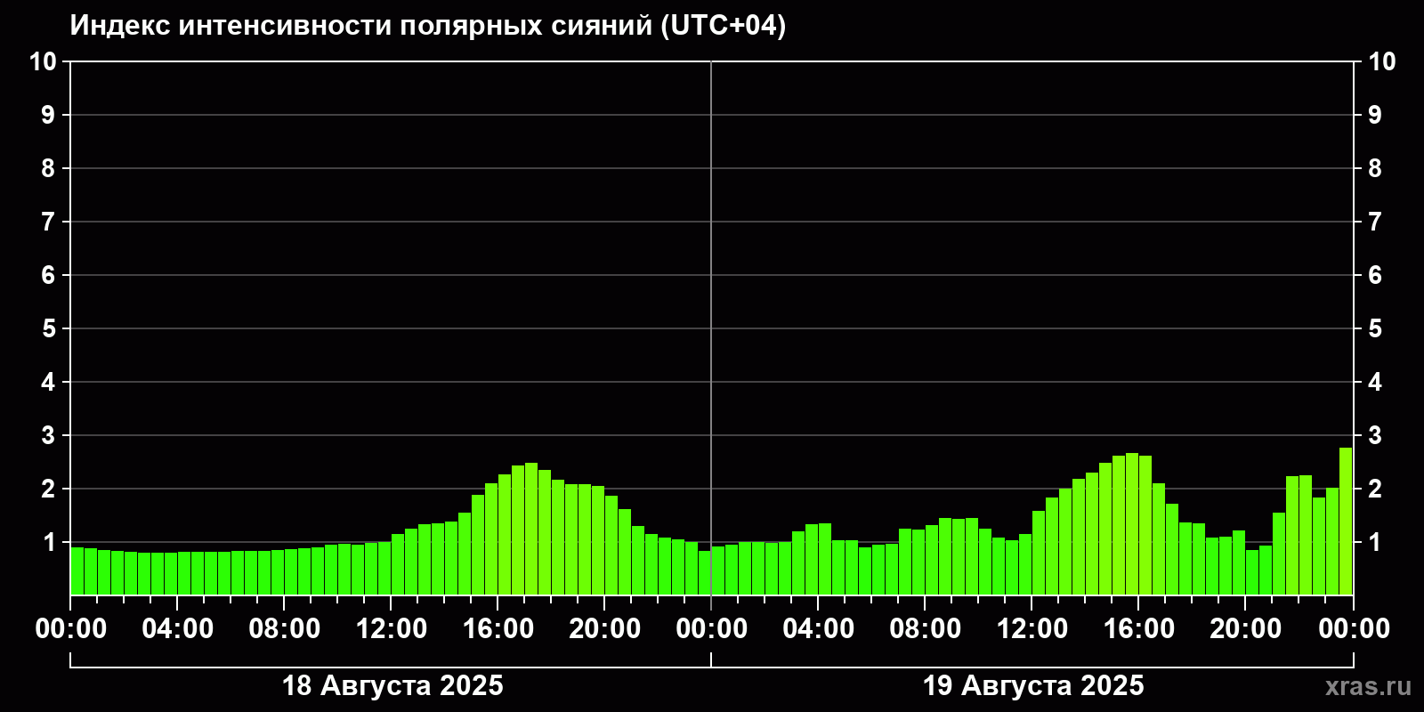 Изменения индекса интенсивности полярных сияний с 2025-08-18 по 2025-08-19 по местному времени