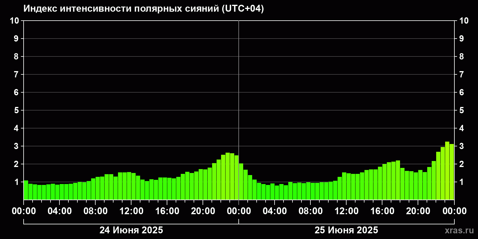 Изменения индекса интенсивности полярных сияний с 2025-06-24 по 2025-06-25 по местному времени
