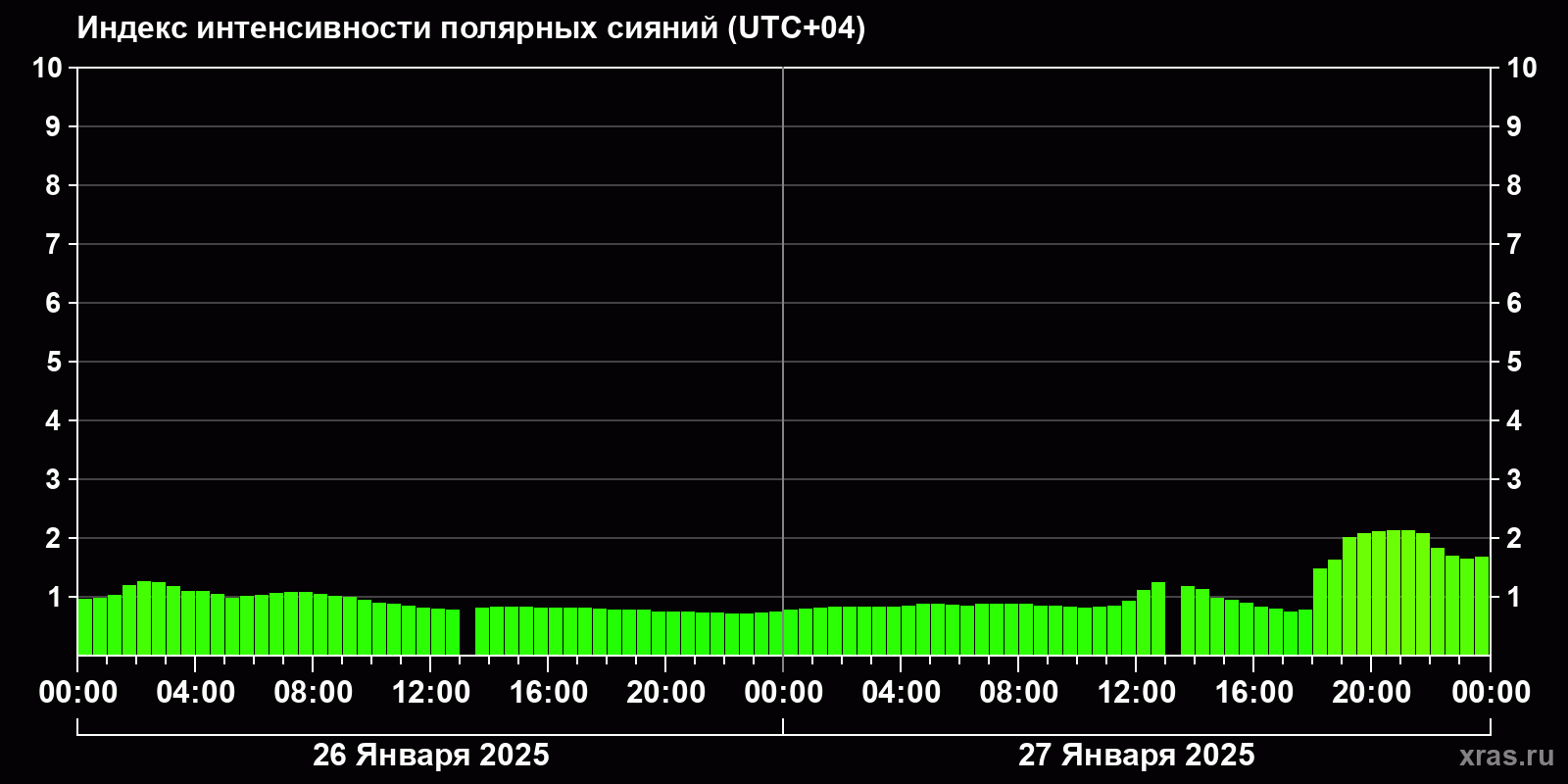 Изменения индекса интенсивности полярных сияний с 2025-01-26 по 2025-01-27 по местному времени
