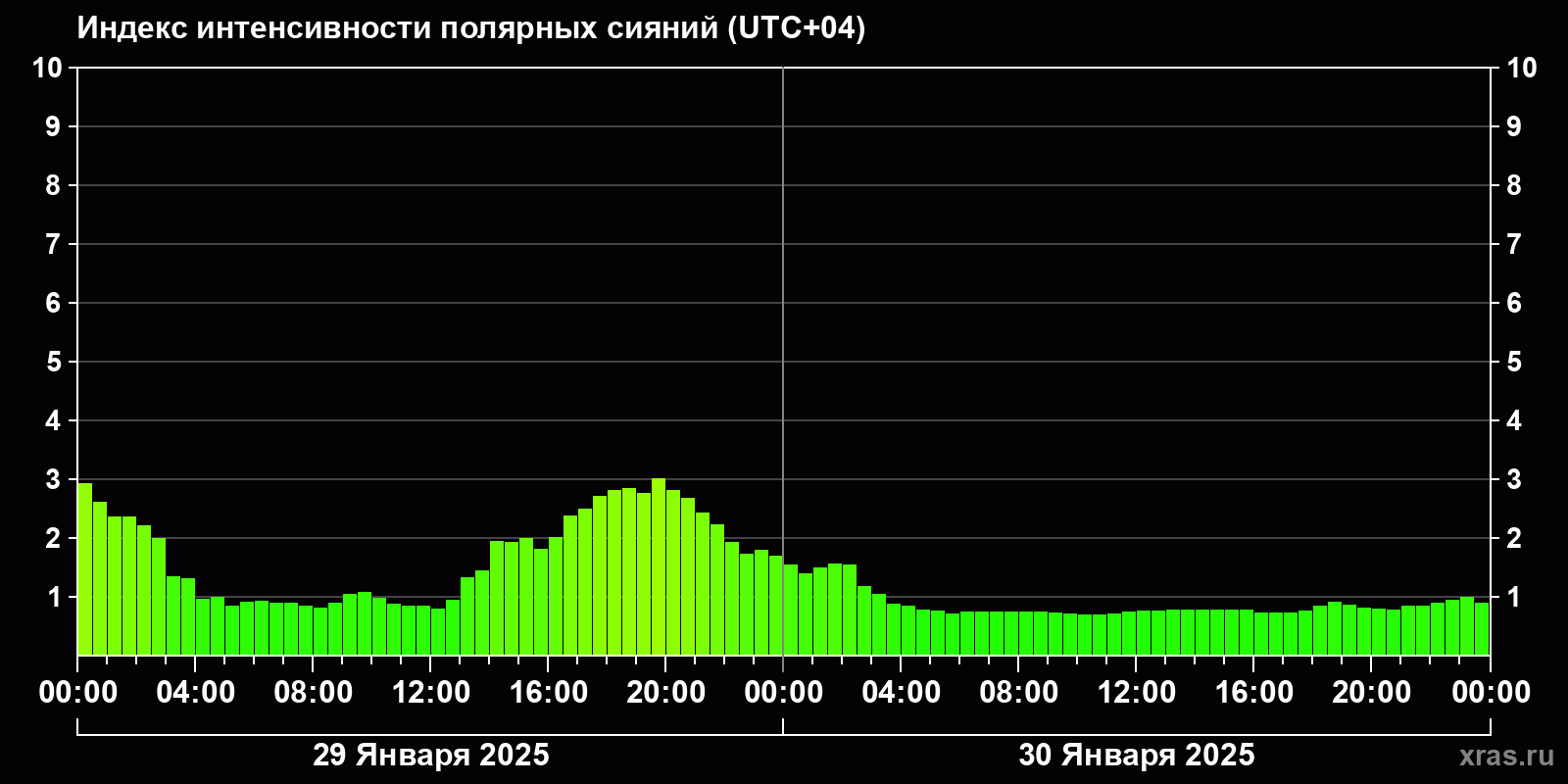 Изменения индекса интенсивности полярных сияний с 2025-01-29 по 2025-01-30 по местному времени