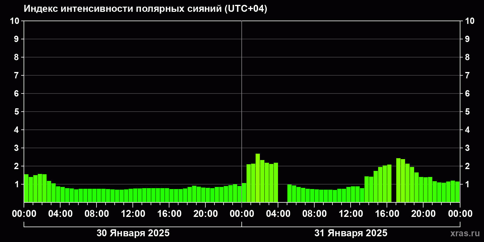 Изменения индекса интенсивности полярных сияний с 2025-01-30 по 2025-01-31 по местному времени