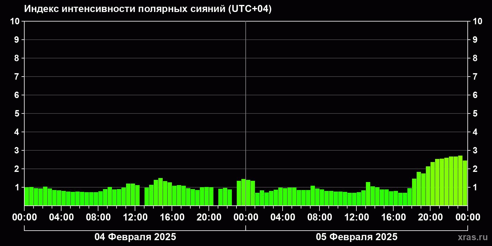 Изменения индекса интенсивности полярных сияний с 2025-02-04 по 2025-02-05 по местному времени