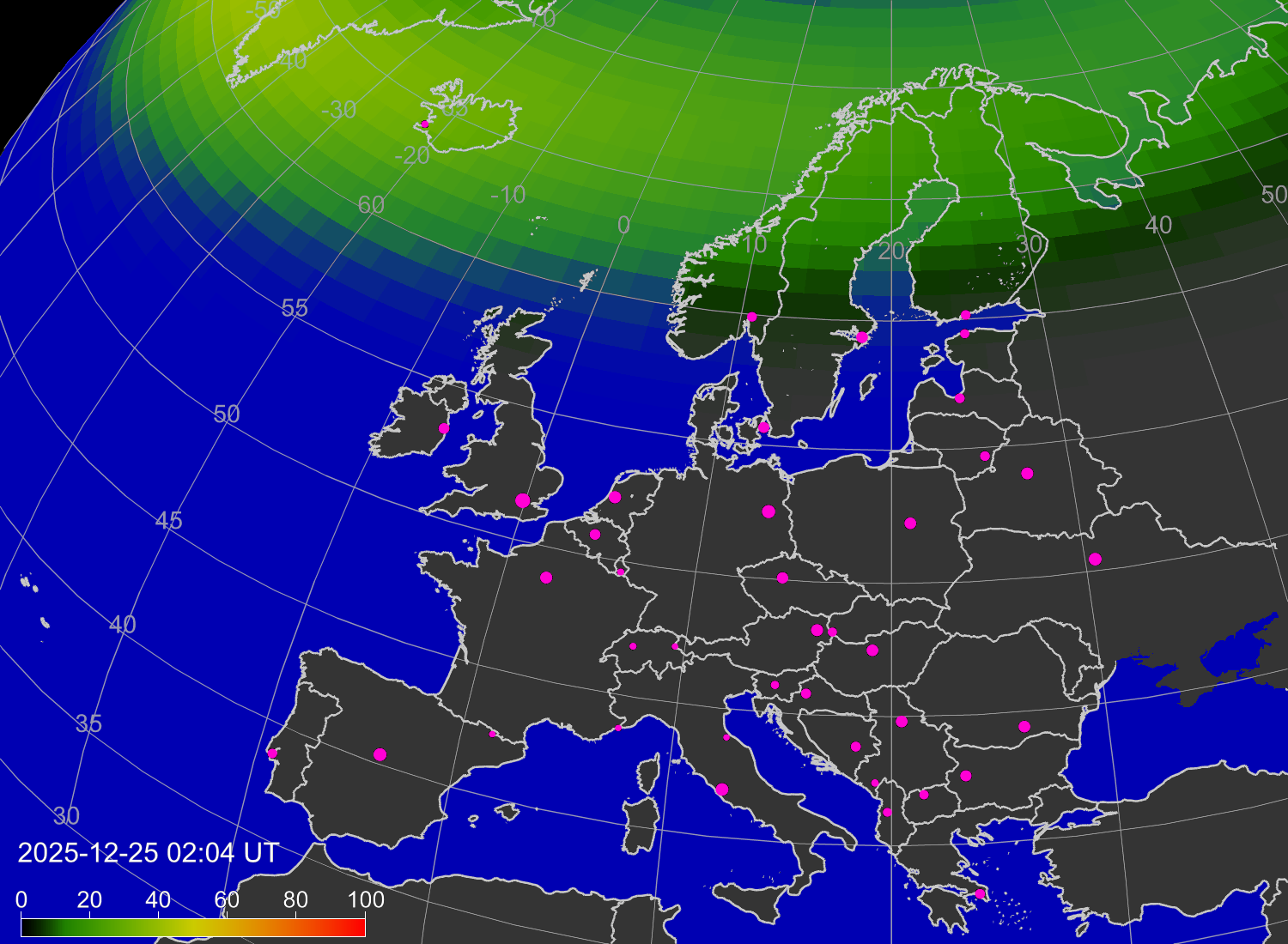 Изменения и часовой прогноз индекса интенсивности полярных сияний с 2025-12-24 по 2025-12-25