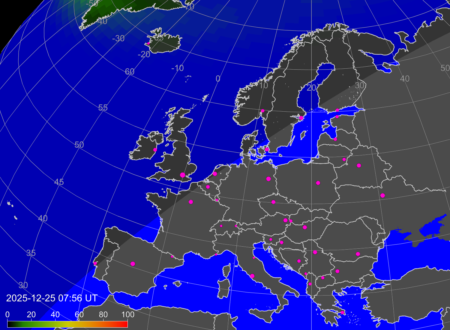 Индекс интенсивности полярных сияний и теоретически возможная широта наблюдений для ночного времени в восточном полушарии