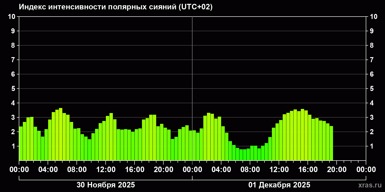 Изменения индекса интенсивности полярных сияний с 2025-11-30 по 2025-12-01 по местному времени