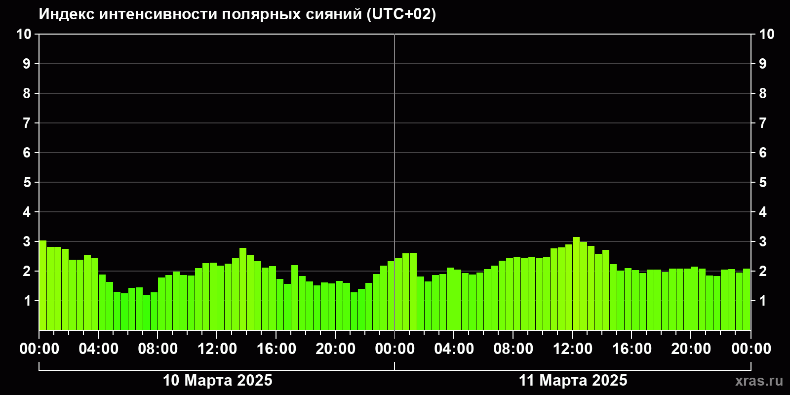 Изменения индекса интенсивности полярных сияний с 2025-03-10 по 2025-03-11 по местному времени