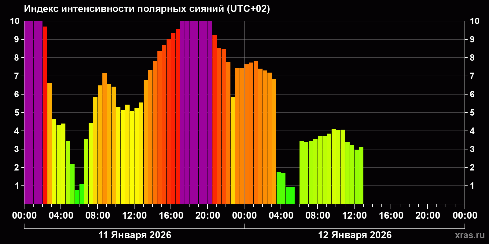 Изменения индекса интенсивности полярных сияний с 2026-01-11 по 2026-01-12 по местному времени
