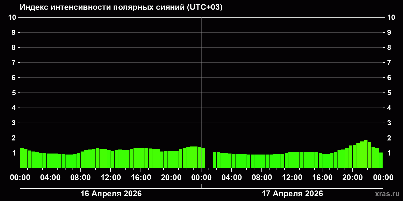 Изменения индекса интенсивности полярных сияний с 2026-04-16 по 2026-04-17 по местному времени