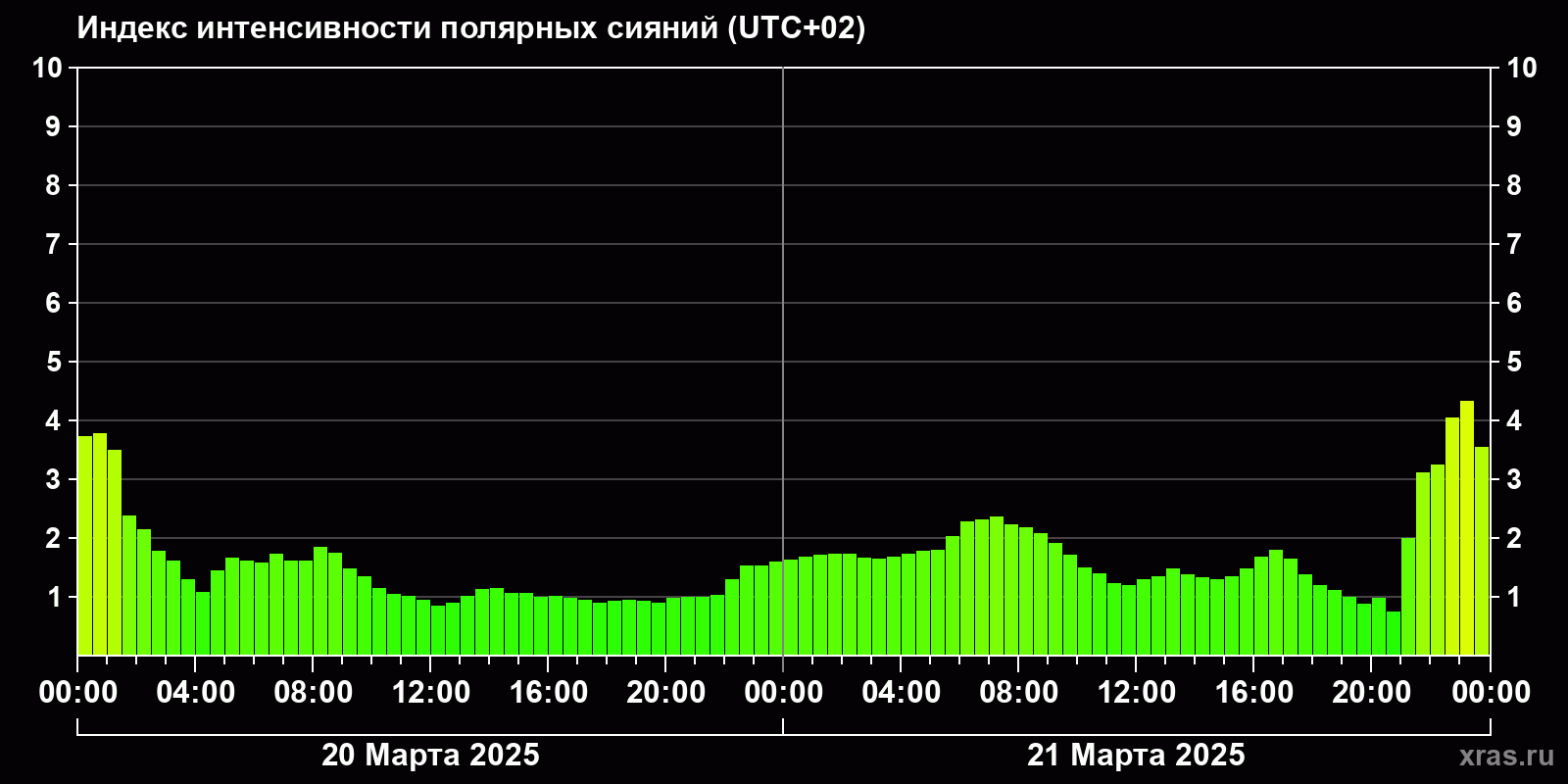 Изменения индекса интенсивности полярных сияний с 2025-03-20 по 2025-03-21 по местному времени