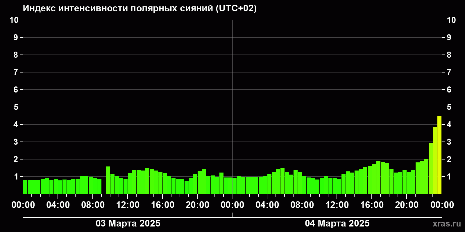 Изменения индекса интенсивности полярных сияний с 2025-03-03 по 2025-03-04 по местному времени