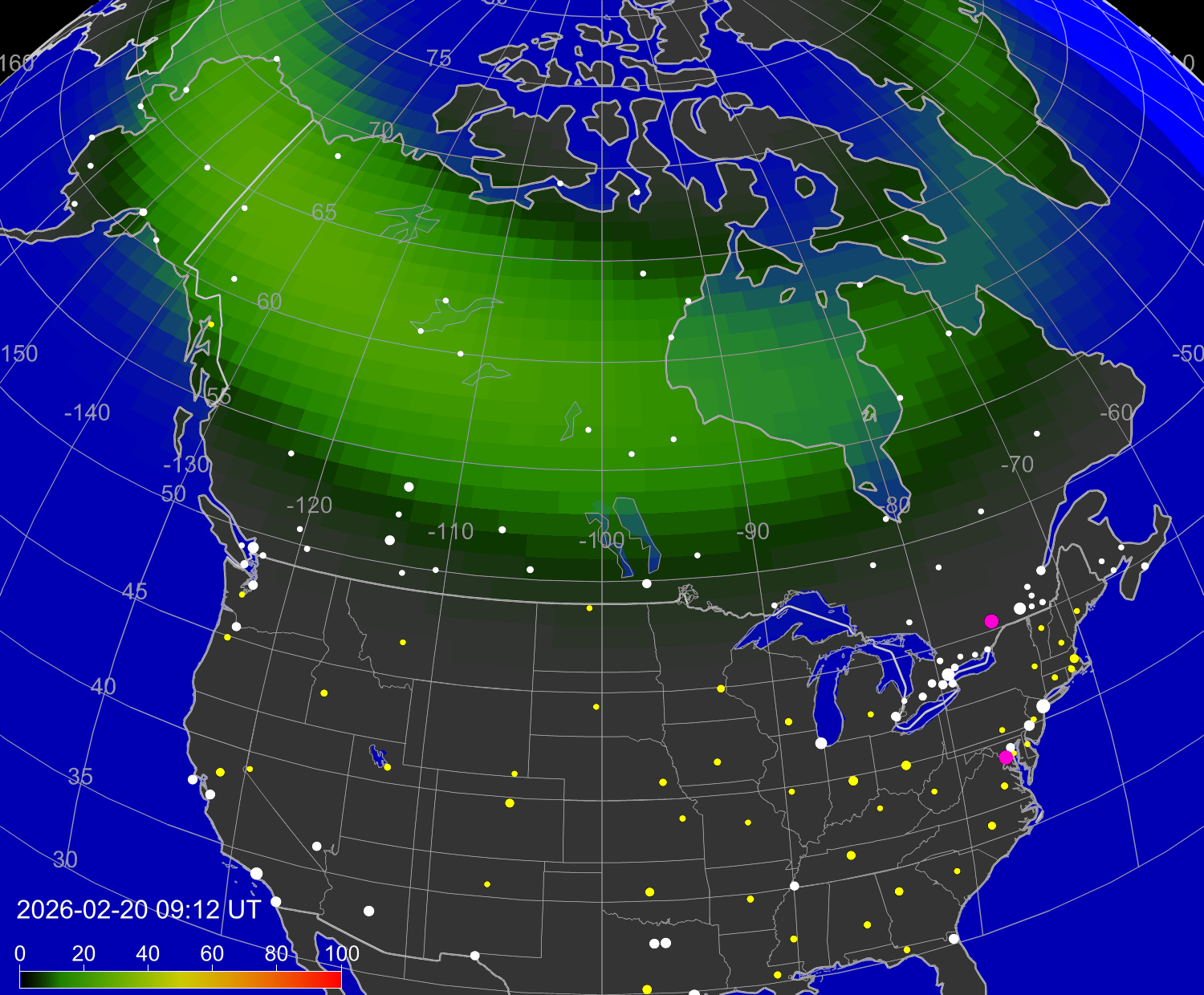 Зона полярных (северных) сияний над территорией Северной Америки