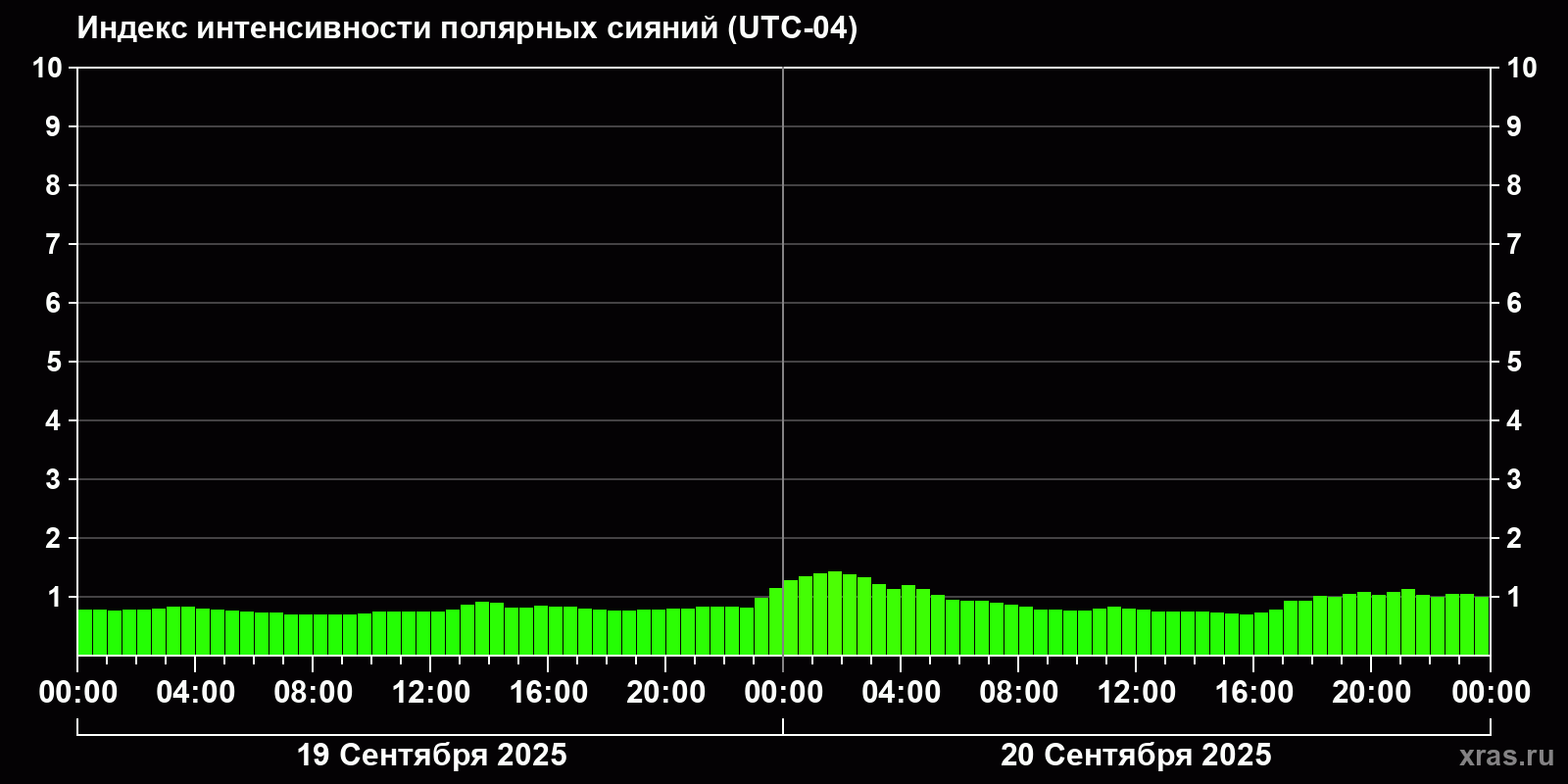 Изменения индекса интенсивности полярных сияний с 2025-09-19 по 2025-09-20 по местному времени
