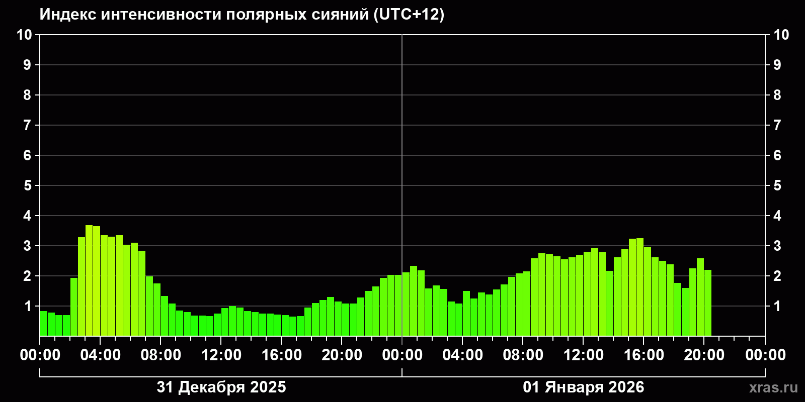 Изменения индекса интенсивности полярных сияний с 2025-12-31 по 2026-01-01 по местному времени