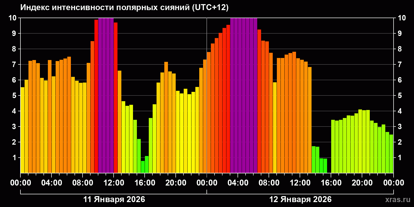 Изменения индекса интенсивности полярных сияний с 2026-01-11 по 2026-01-12 по местному времени