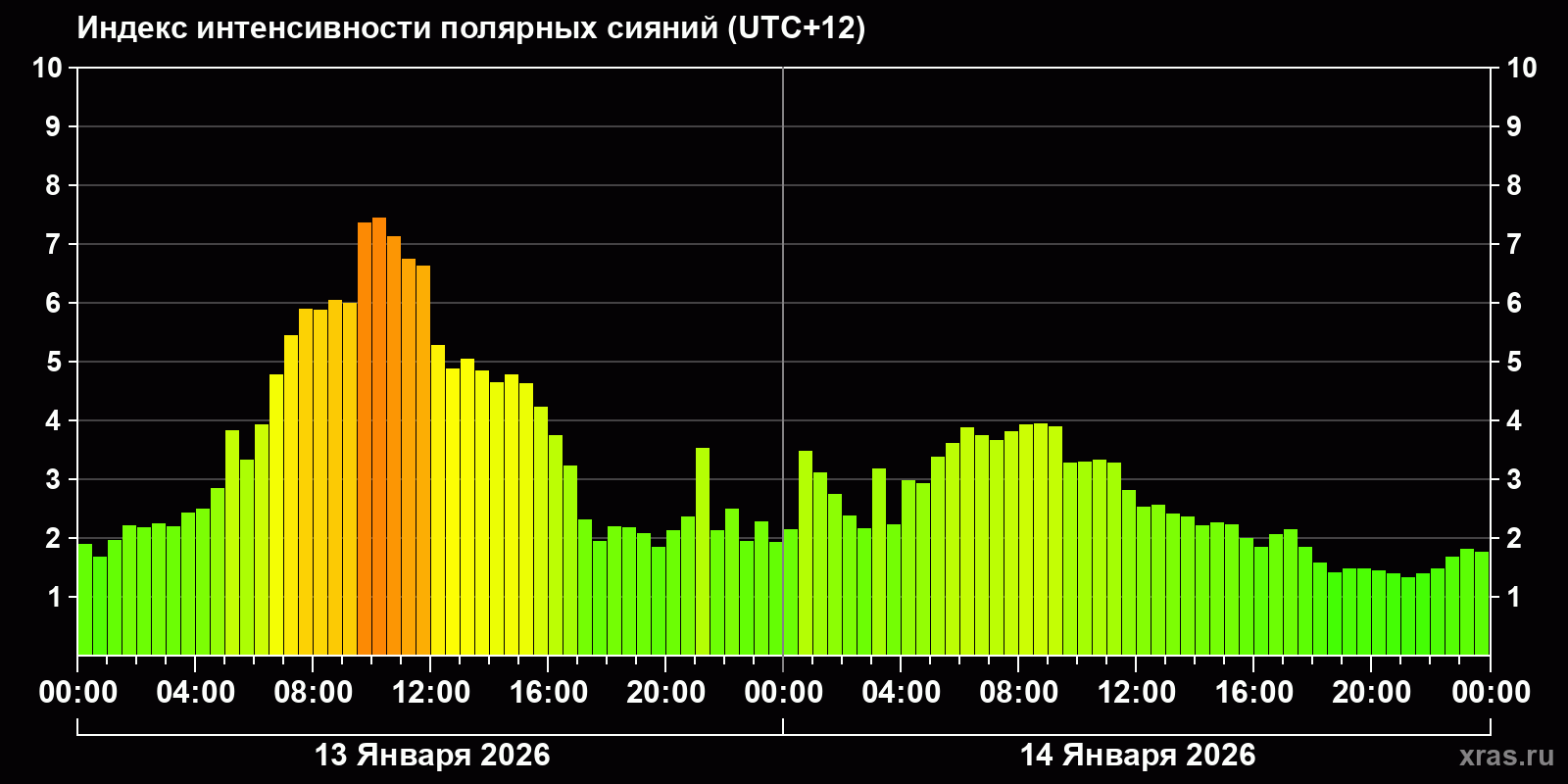 Изменения индекса интенсивности полярных сияний с 2026-01-13 по 2026-01-14 по местному времени