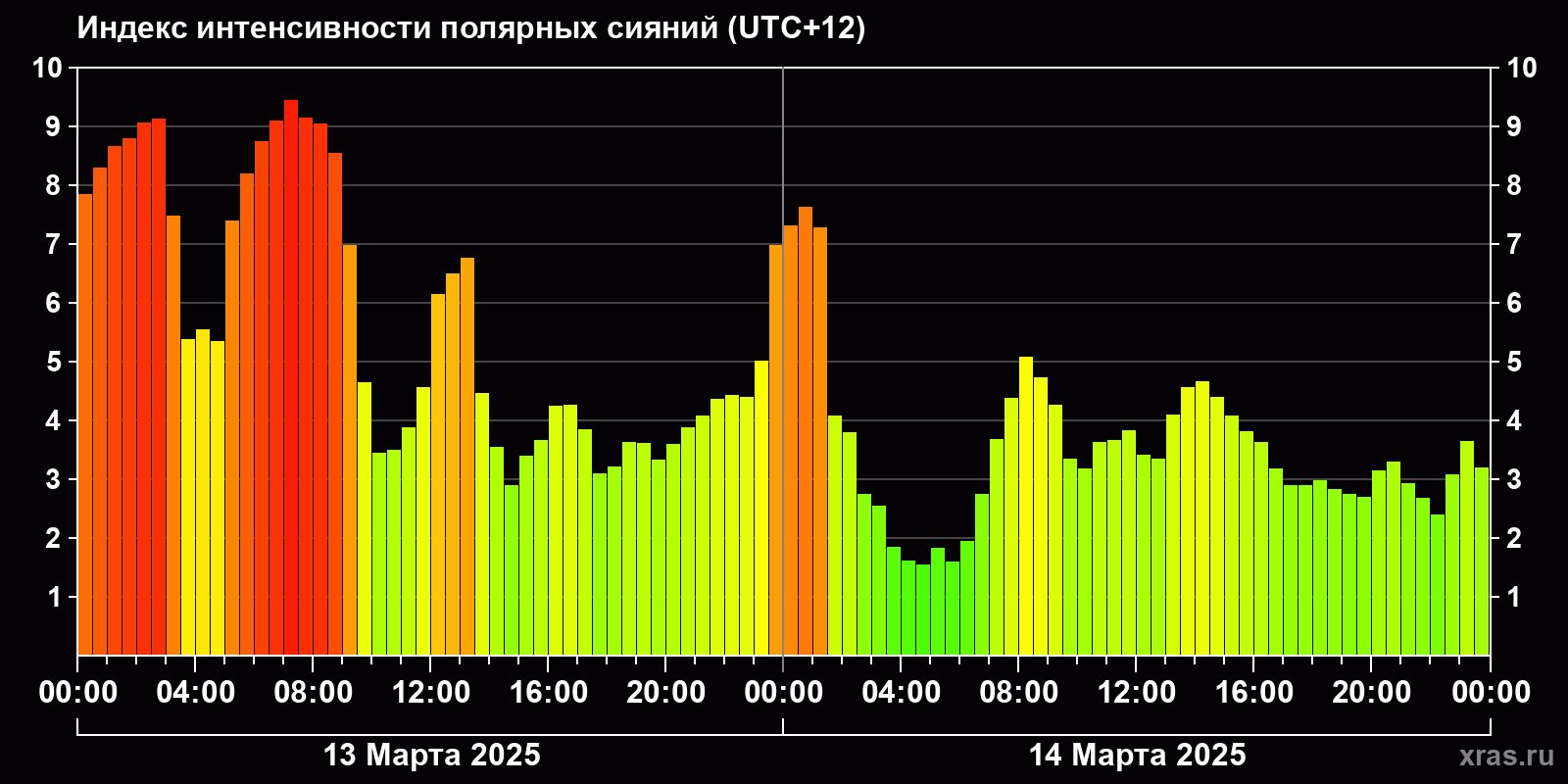 Изменения индекса интенсивности полярных сияний с 2025-03-13 по 2025-03-14 по местному времени
