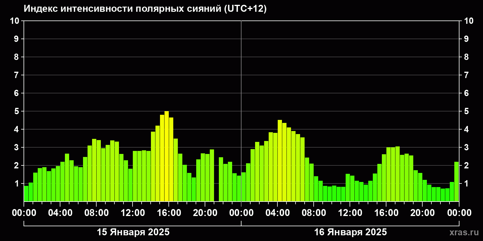 Изменения индекса интенсивности полярных сияний с 2025-01-15 по 2025-01-16 по местному времени