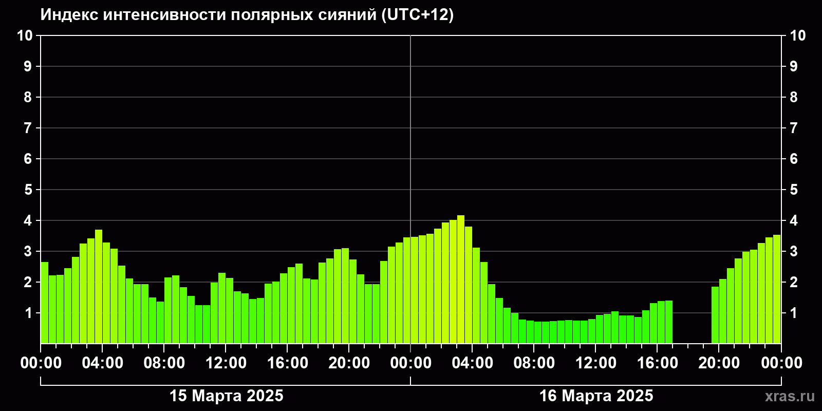 Изменения индекса интенсивности полярных сияний с 2025-03-15 по 2025-03-16 по местному времени