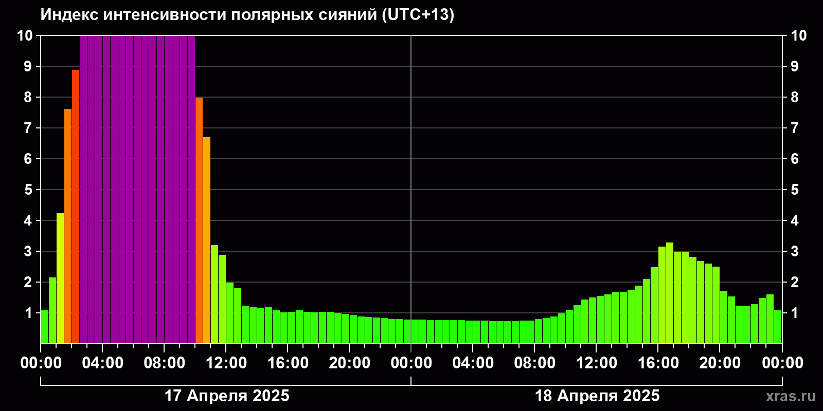 Изменения индекса интенсивности полярных сияний с 2025-04-17 по 2025-04-18 по местному времени