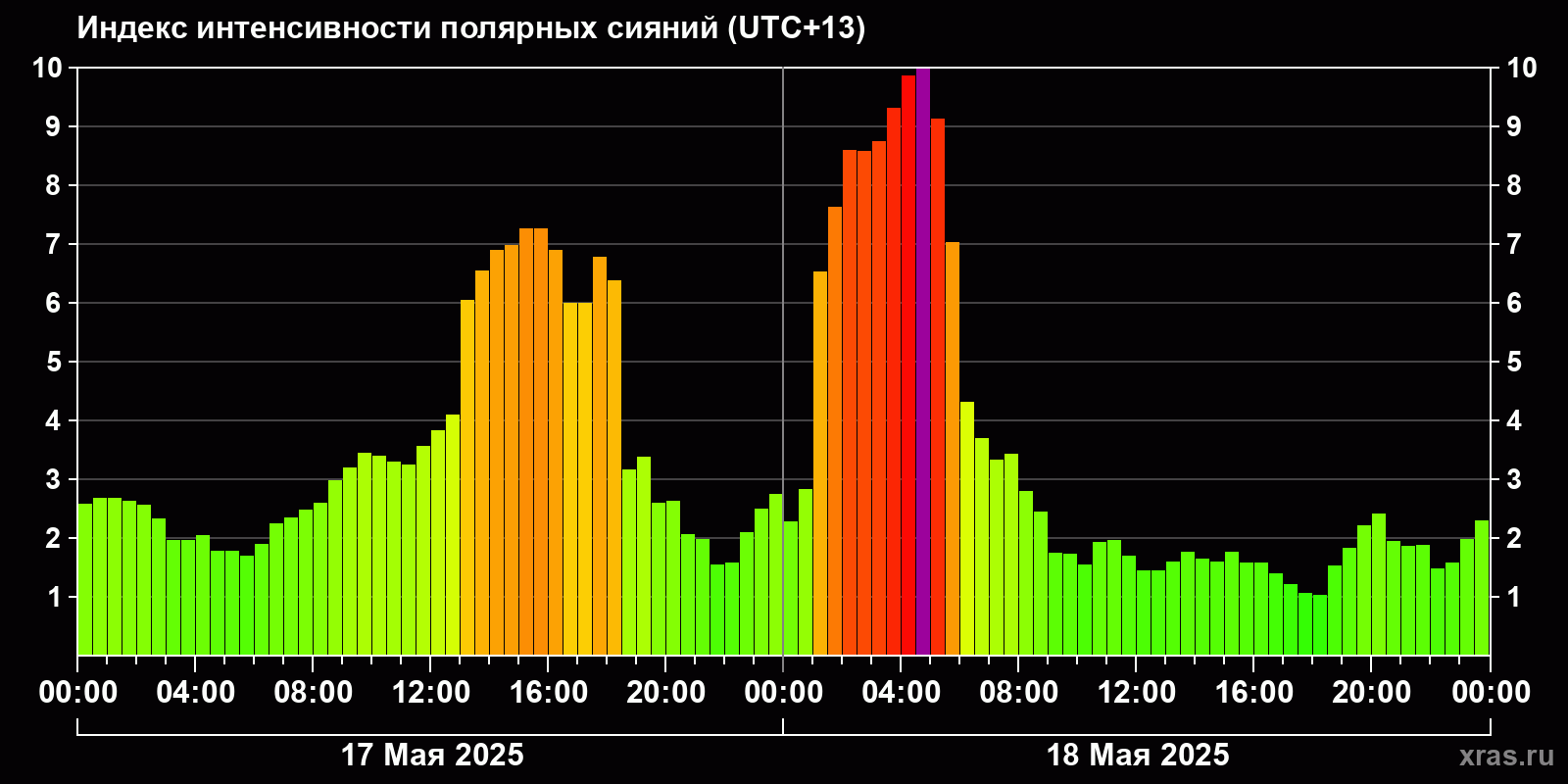 Изменения индекса интенсивности полярных сияний с 2025-05-17 по 2025-05-18 по местному времени