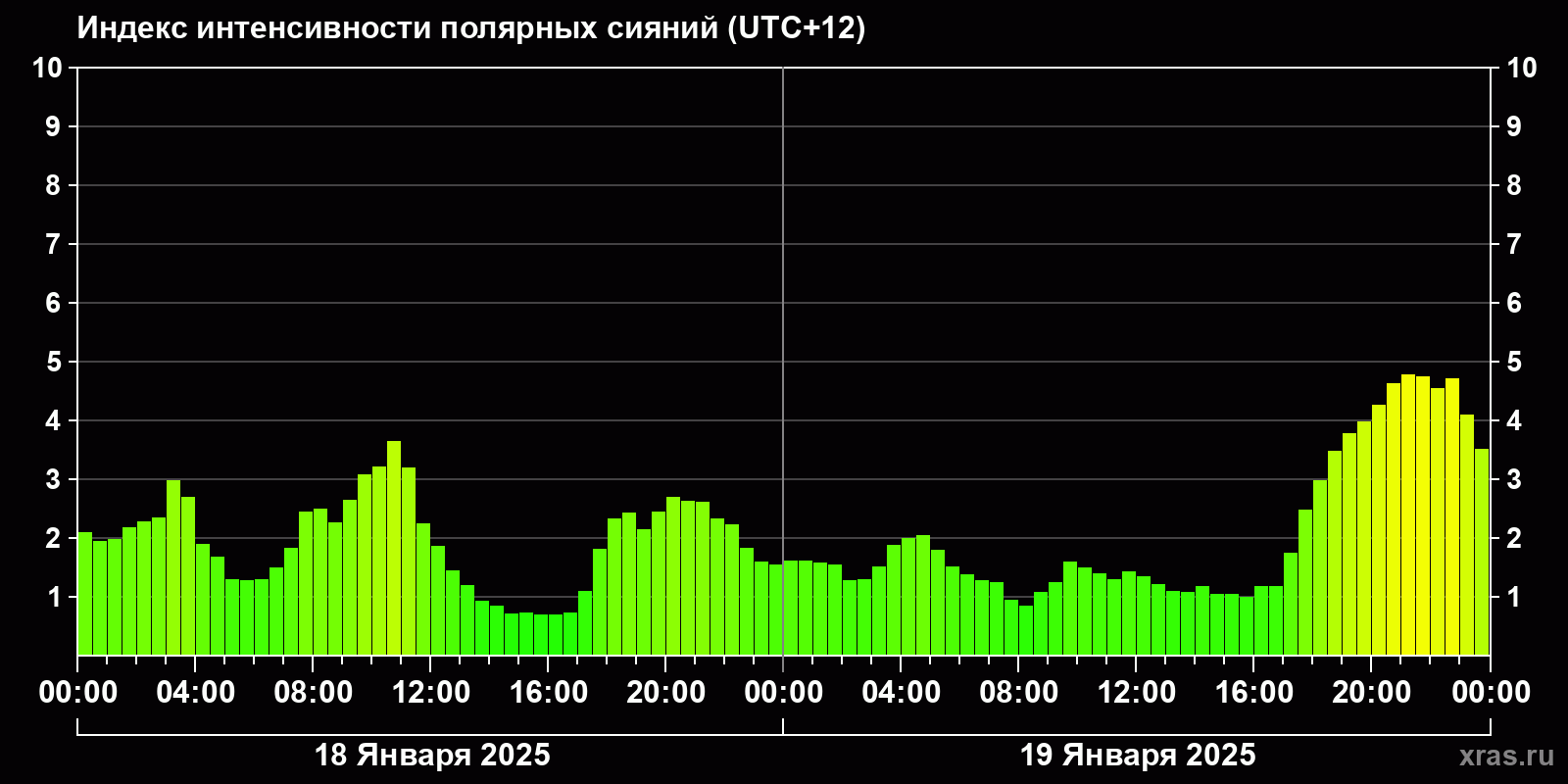 Изменения индекса интенсивности полярных сияний с 2025-01-18 по 2025-01-19 по местному времени